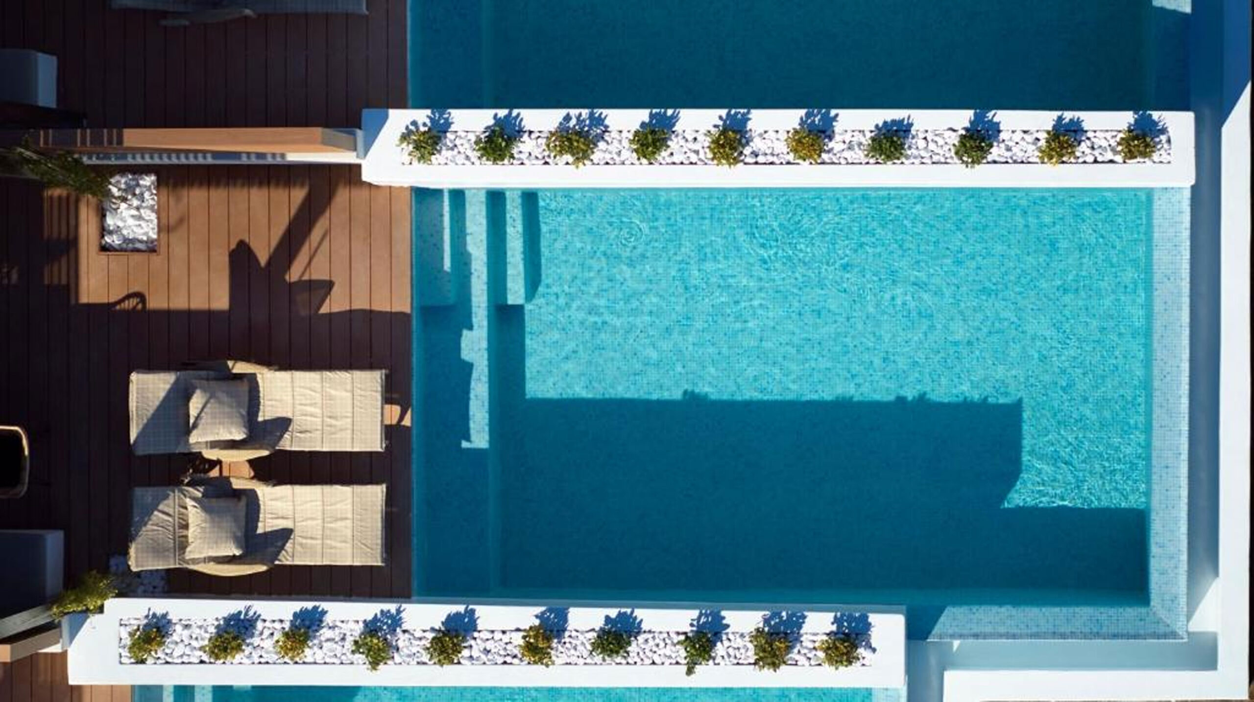 The 9 Muses Hotel in Perivolos of Santorini is an architectural composition of high aesthetics, where Cycladic tradition meets modern design in an environment of unique natural beauty. This luxury resort offers a complete experience, where architecture, landscape and hospitality form a harmonious whole. The design of the hotel follows the principles of authentic Cycladic architecture, with white plaster, soft curves and characteristic domes that highlight the continuity between the built environment and the Aegean landscape. At the same time, the contemporary design approach incorporates large glass surfaces and stone elements, allowing for the constant interaction of the interior with the exterior and reinforcing the connection of the space with the light and the sea. The layout of the buildings, the alternation of open and semi-open spaces, as well as the use of natural materials, compose a multi-level environment that offers total relaxation and privacy. The central pools, with their simple geometries and water reflections, act as focal points of tranquility, while the outdoor spaces, with carefully designed shades and unobstructed views of the volcanic landscape, enhance the sense of escape.