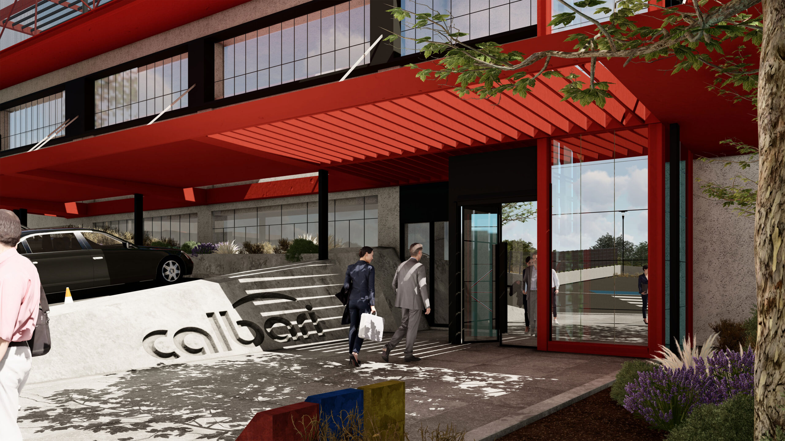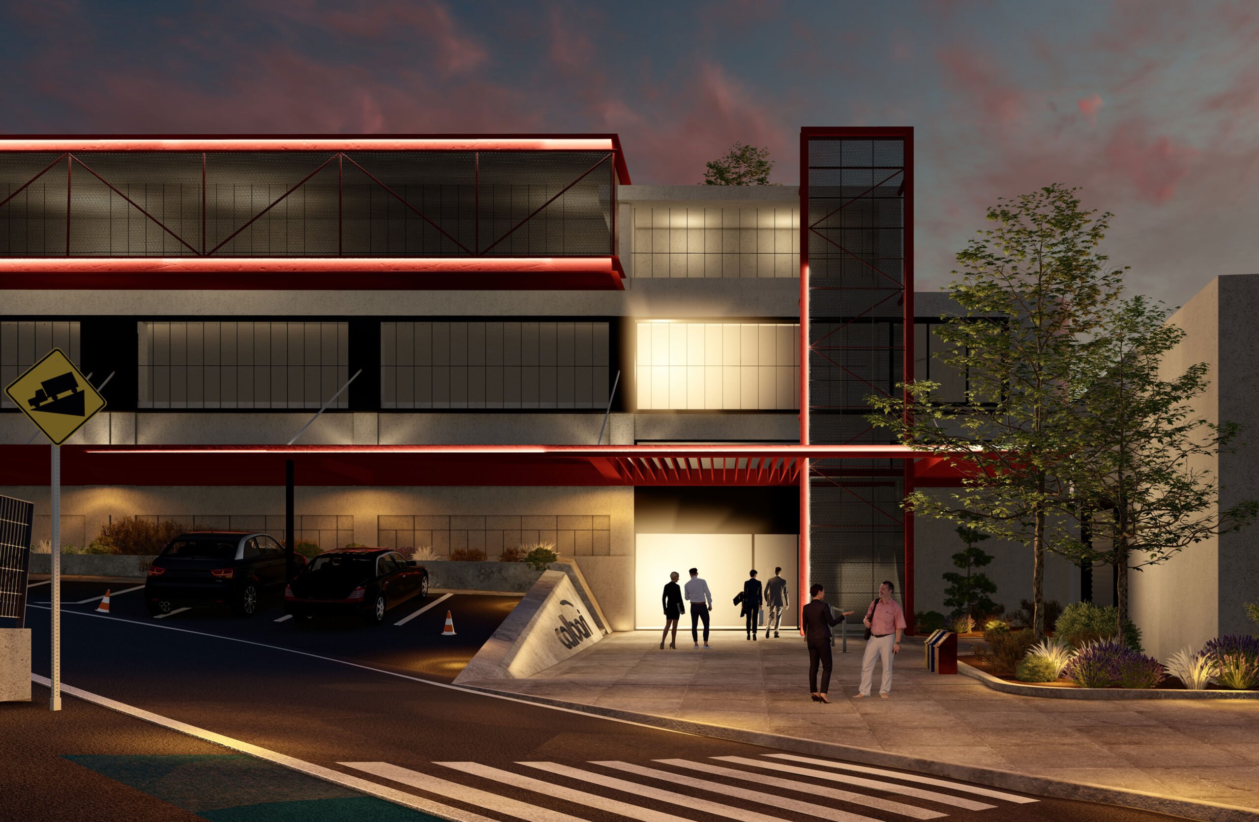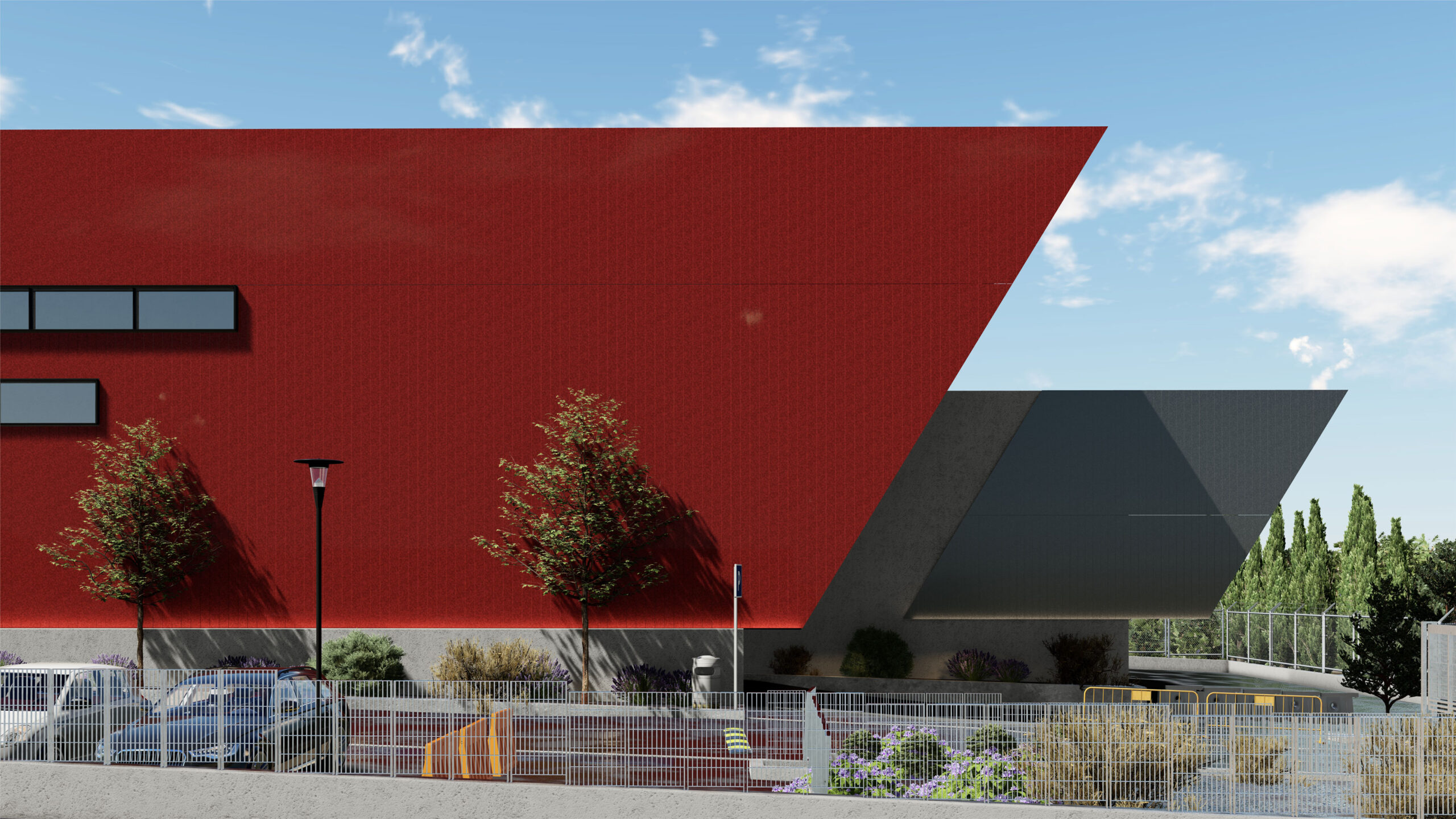 It is an industrial building in an industrial area in Koropi. The aim is to redefine the aesthetics of the Brand, through a composition that balances between robustness and dynamic expression. Metal dominates as the main material, conveying a sense of rigidity and durability, while large mirror surfaces diffuse light and reflect the environment, creating an ever-changing play of reflection. Bright red elements, inspired by the corporate logo, run through the façade, introducing a chromatic intensity that breaks the monochrome of the metal surfaces and highlights the building’s identity. The entrance is accentuated by a distinctive red canopy, which acts as a reference point and adds a sculptural dimension to the building ensemble. Inside, the industrial aesthetic continues with prominent structural elements, metal frames and large-scale surfaces, but the atmosphere takes on a warmer dimension through targeted materiality and lighting interventions. The balance between cool industrial character and warm functionality creates an environment that exudes both the power of technology and the human-centric dimension of design.