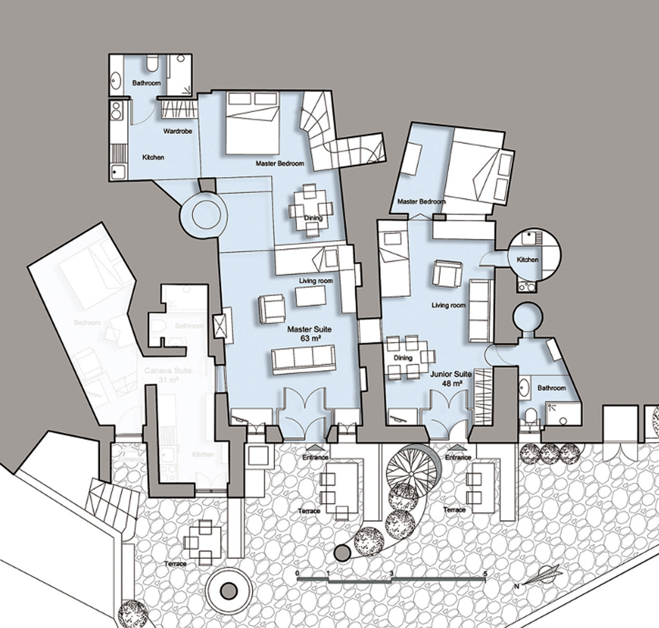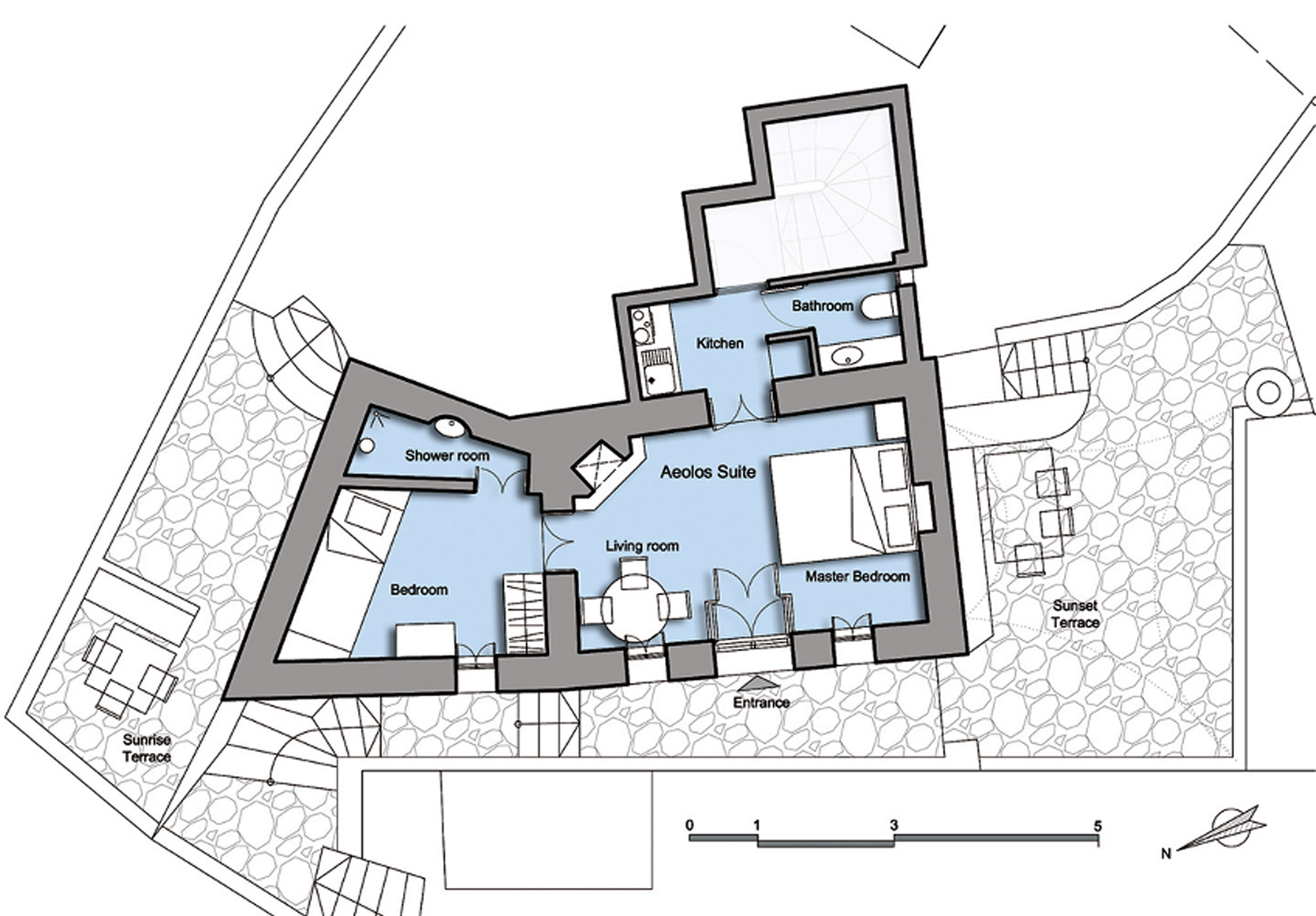 Το ξενοδοχείο βρίσκεται στον παραδοσιακό Οικισμό Φοινικιά της Σαντορίνης και αποτελεί ένα συγκρότημα 12 κατοικιών ενταγμένων σε διατηρητέα κτισμάτα, με αρχική χρονολογία κατασκευής στα τέλη του 19ου αιώνα. Κατά τη διάρκεια της ανακατασκευής χρησιμοποιήθηκαν μέθοδοι που ακολουθούν την τοπική βιοκλιματική αρχιτεκτονική και υλικά με χαμηλή ενσωματωμένη ενέργεια. Όλα τα κτίρια έχουν θέα στο ηλιοβασίλεμα του νησιού και τα Νησιά της Ίου, Σίκινου και Φολεγάνδρου. O σχεδιασμός και η ανακατασκευή είχε ως στόχο το σεβασμό στην παράδοση και την αρχιτεκτονική της εποχής καθώς και την απόλυτα αρμονική ένταξη του στο περιβάλλον και το τοπίο του οικισμού της Φοινικιάς. Διαθέτει μια λιτή και απέριττη εσωτερική διάταξη και διακόσμηση πλαισιωμένη από χειροποίητα κτιστά έπιπλα και κρυφούς φωτισμούς που δίνουν μια αίσθηση οικειότητας ζεστασιάς και τη νοσταλγία μια άλλης εποχής, χωρίς όμως να στερείται πολυτέλειας και τεχνολογικής άνεσης. Ένας χώρος – καταφύγιο για επισκέπτες που ξέρουν να αναγνωρίζουν την αισθητική εμπειρία του χώρου βιώνοντας μια ετεροτοπία.
