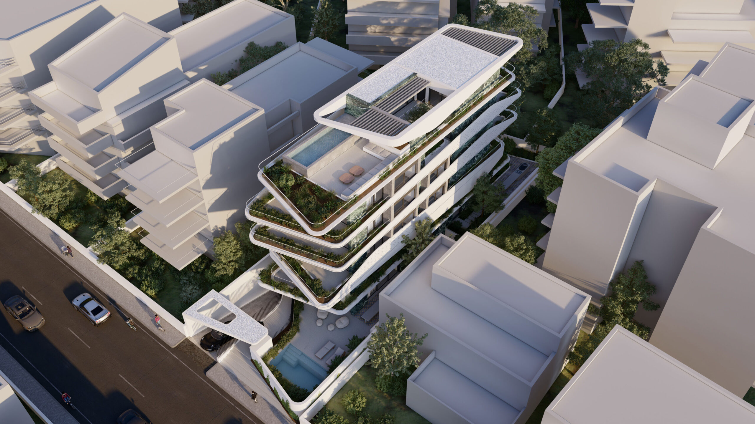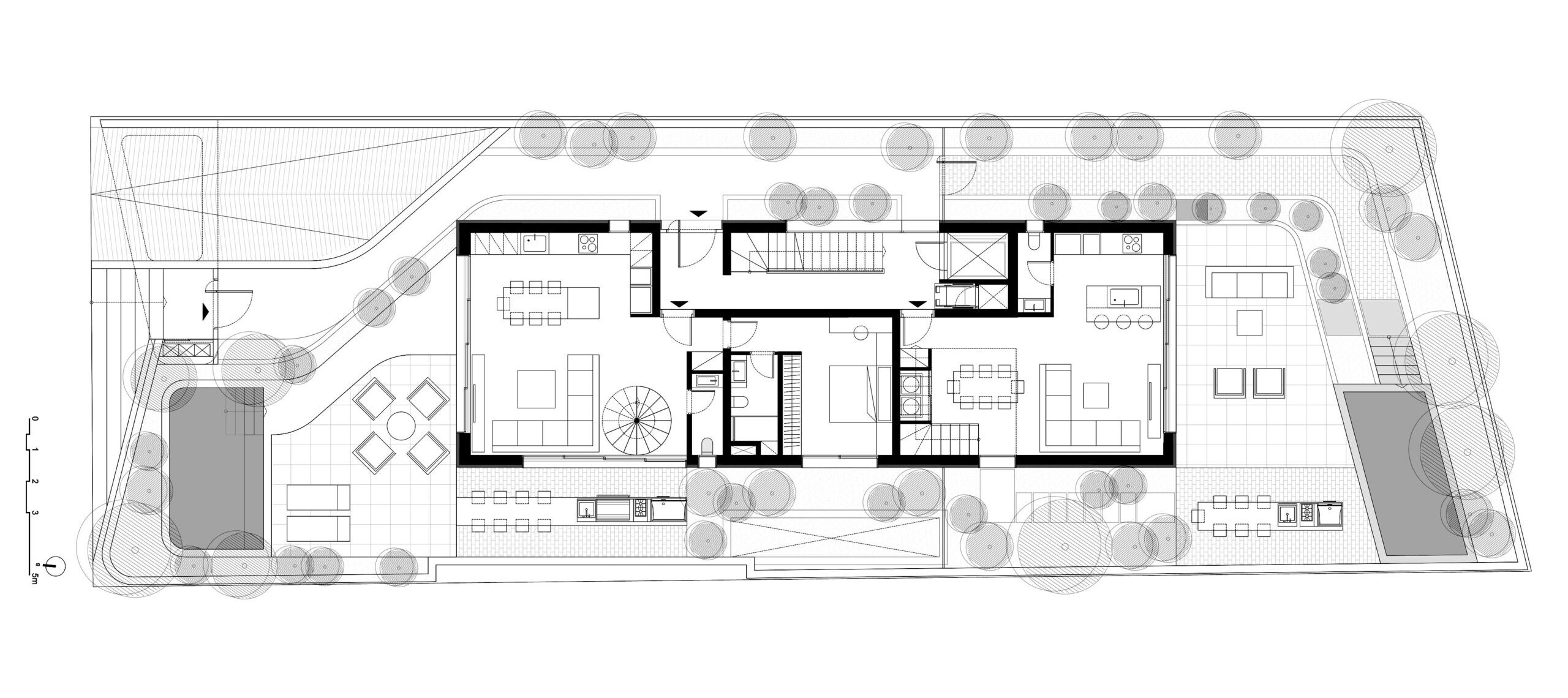 The composition follows the straightforward linearity of the plot, maximizing the footage to accommodate 5 luxurious apartments, exterior green spaces, and a private roof garden and pool.