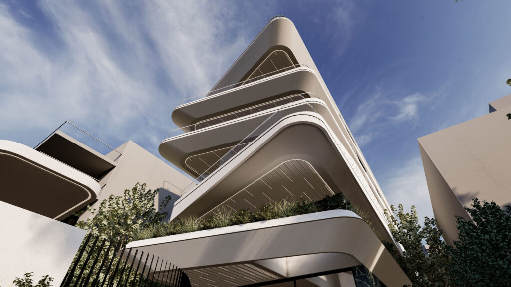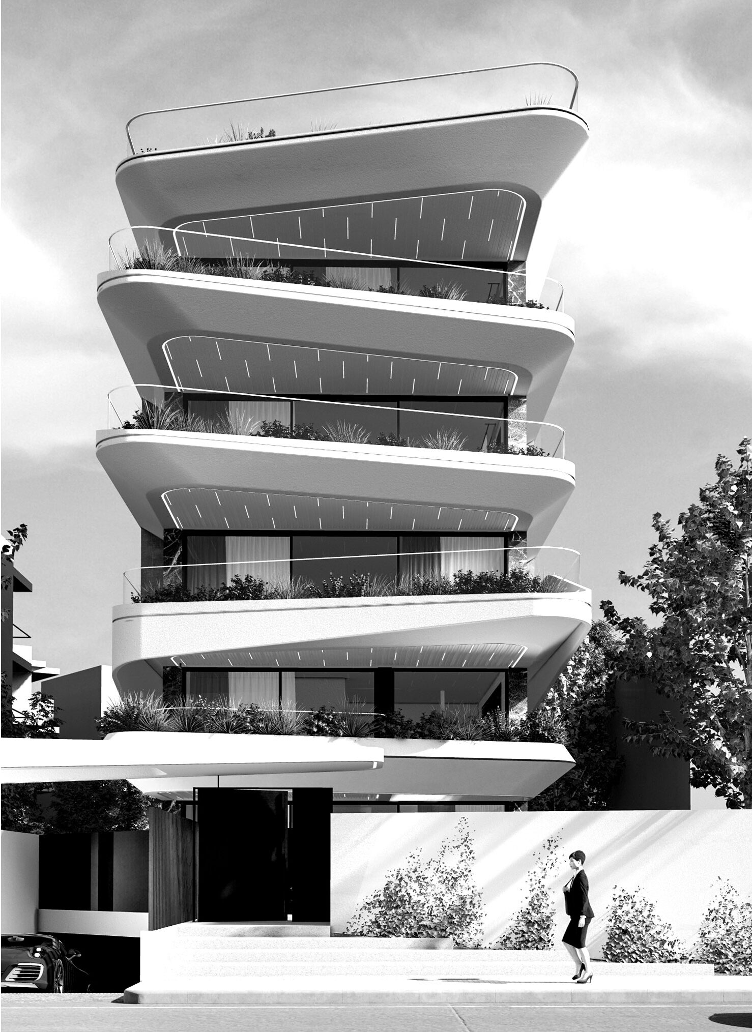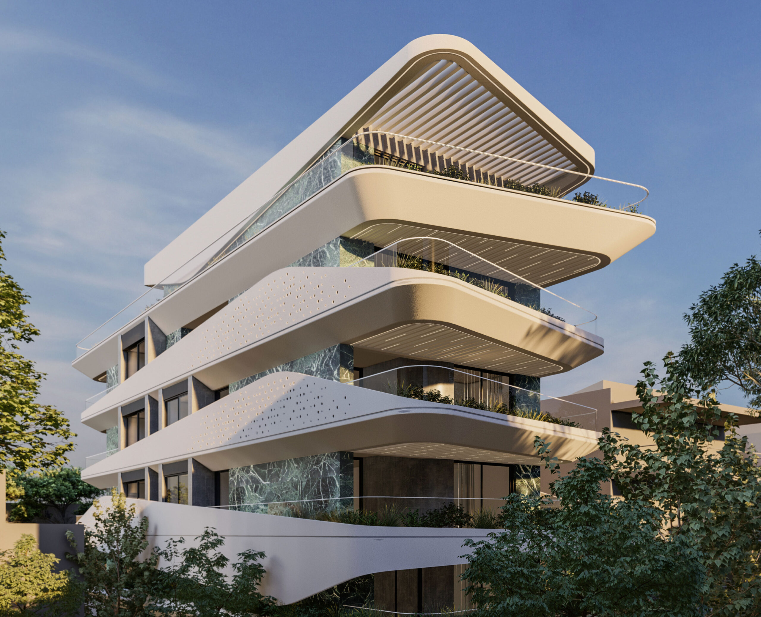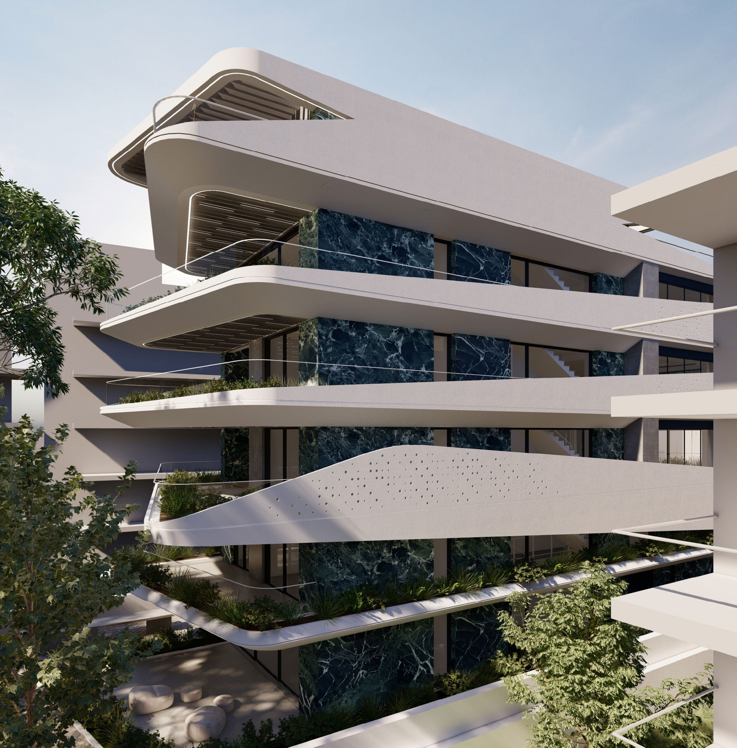 Η αρχιτεκτονική σύνθεση ακολουθεί την καθαρή γραμμικότητα του οικοπέδου, αναπτύσσεται σε 6 ορόφους και φιλοξενεί 5 πολυτελή διαμερίσματα, εξωτερικούς χώρους πρασίνου, καθώς και ένα ιδιωτικό roof garden με πισίνα.