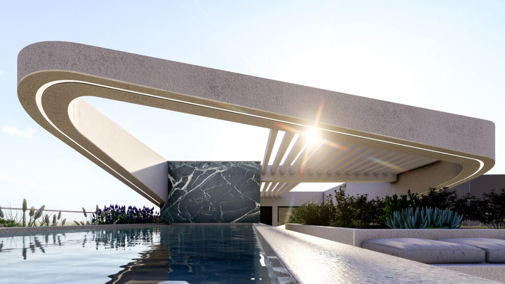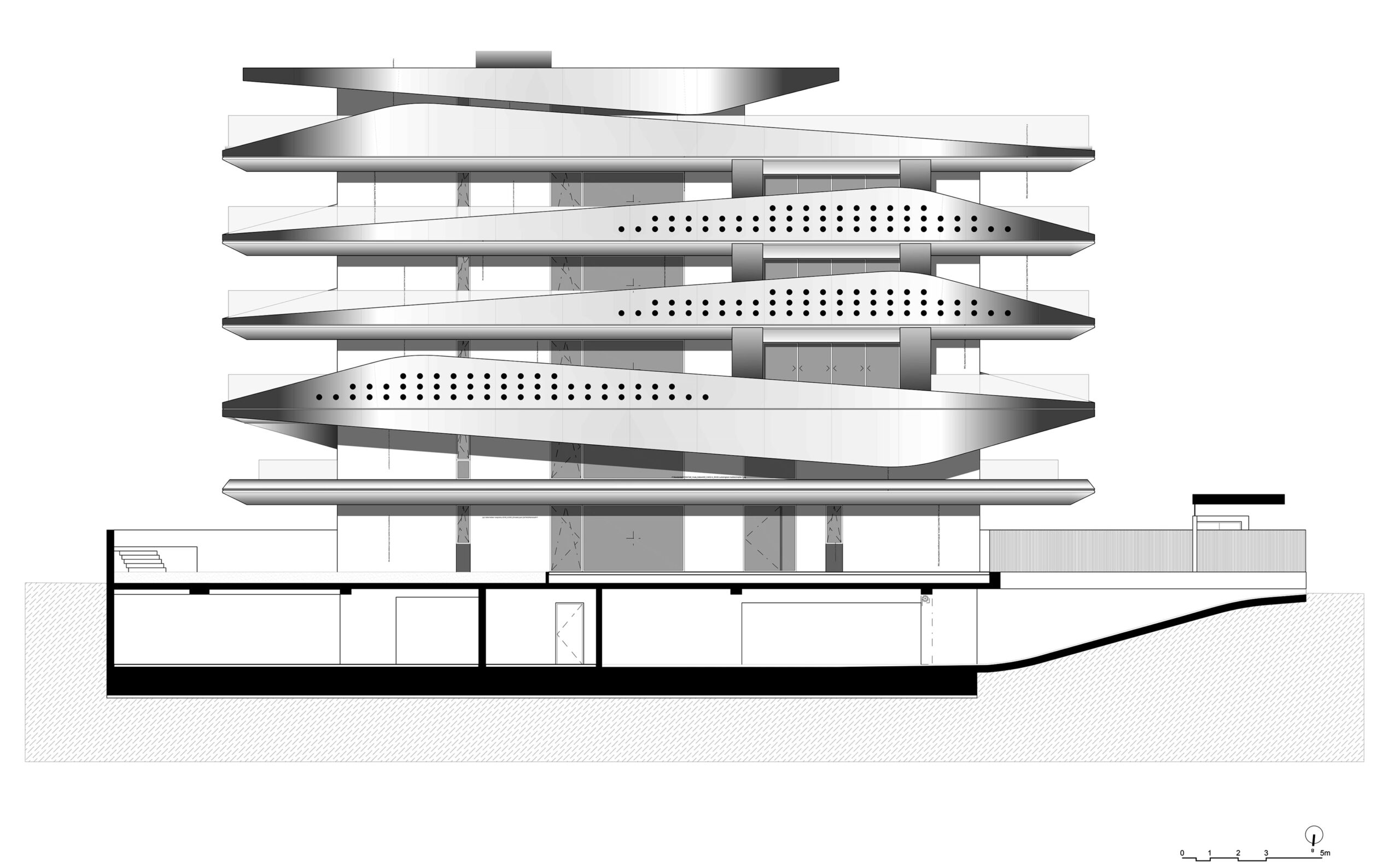 To avoid the dense proximity of the adjacent plots, allow for views towards the far-off landscape and mountains, and promote a sense of privacy, the main programmatic volume is wrapped in an array of planted curved balconies, whose ever-changing directionality changes based on each apartment’s immediate vicinity. Linear perforated metal sheets envelop the curvilinear balconies giving a rhythmic playfulness to the structure.