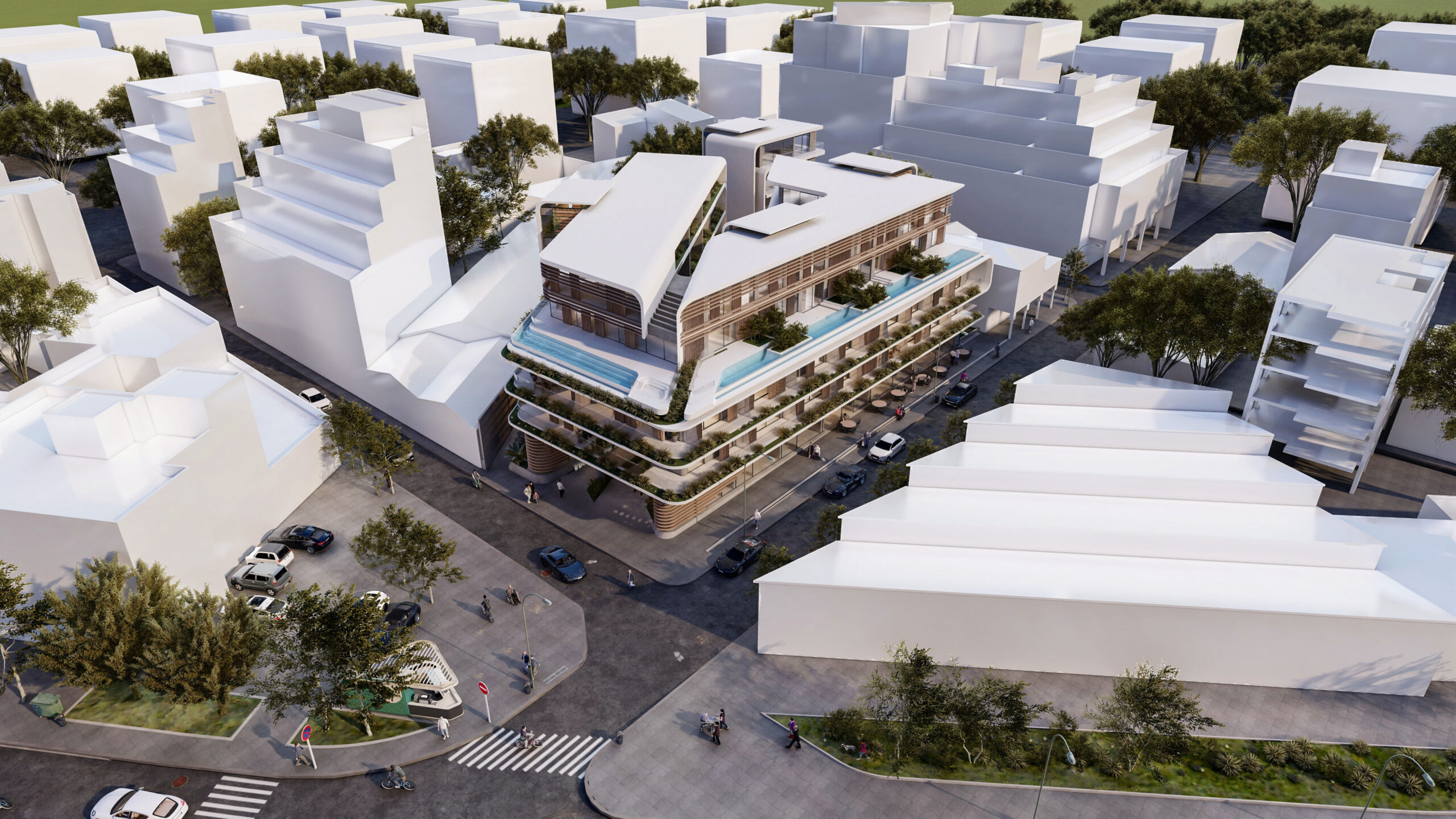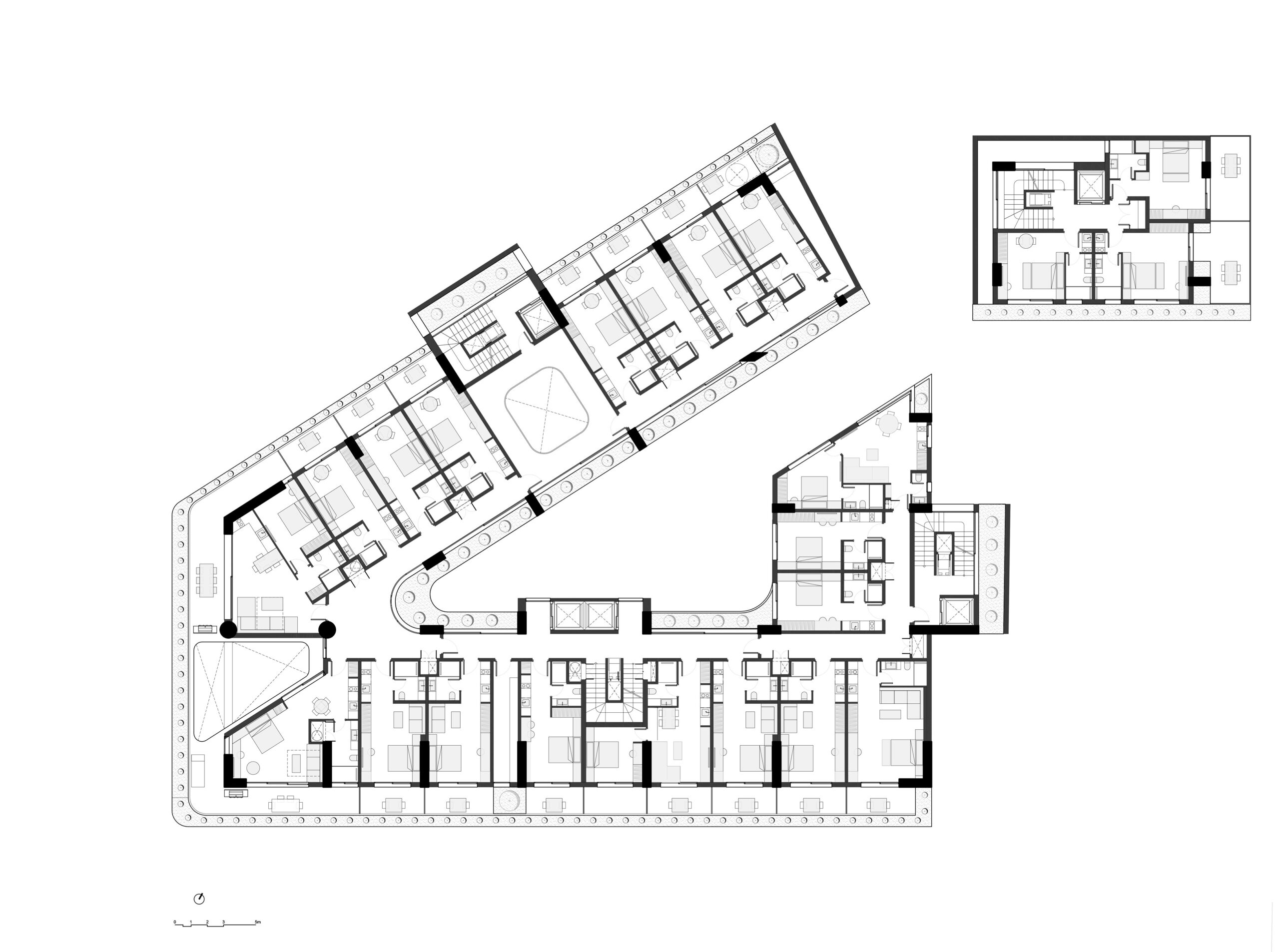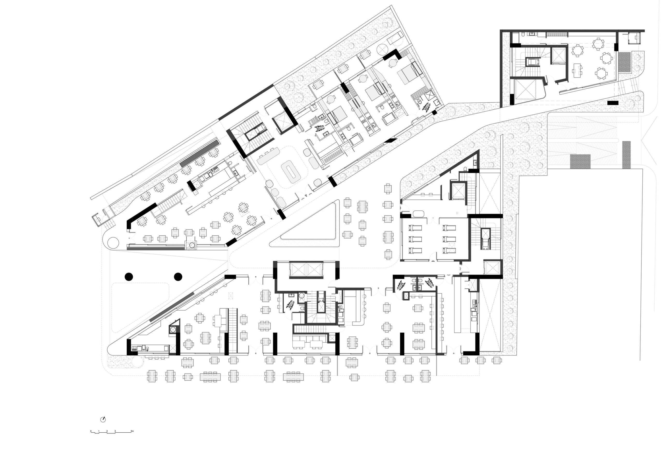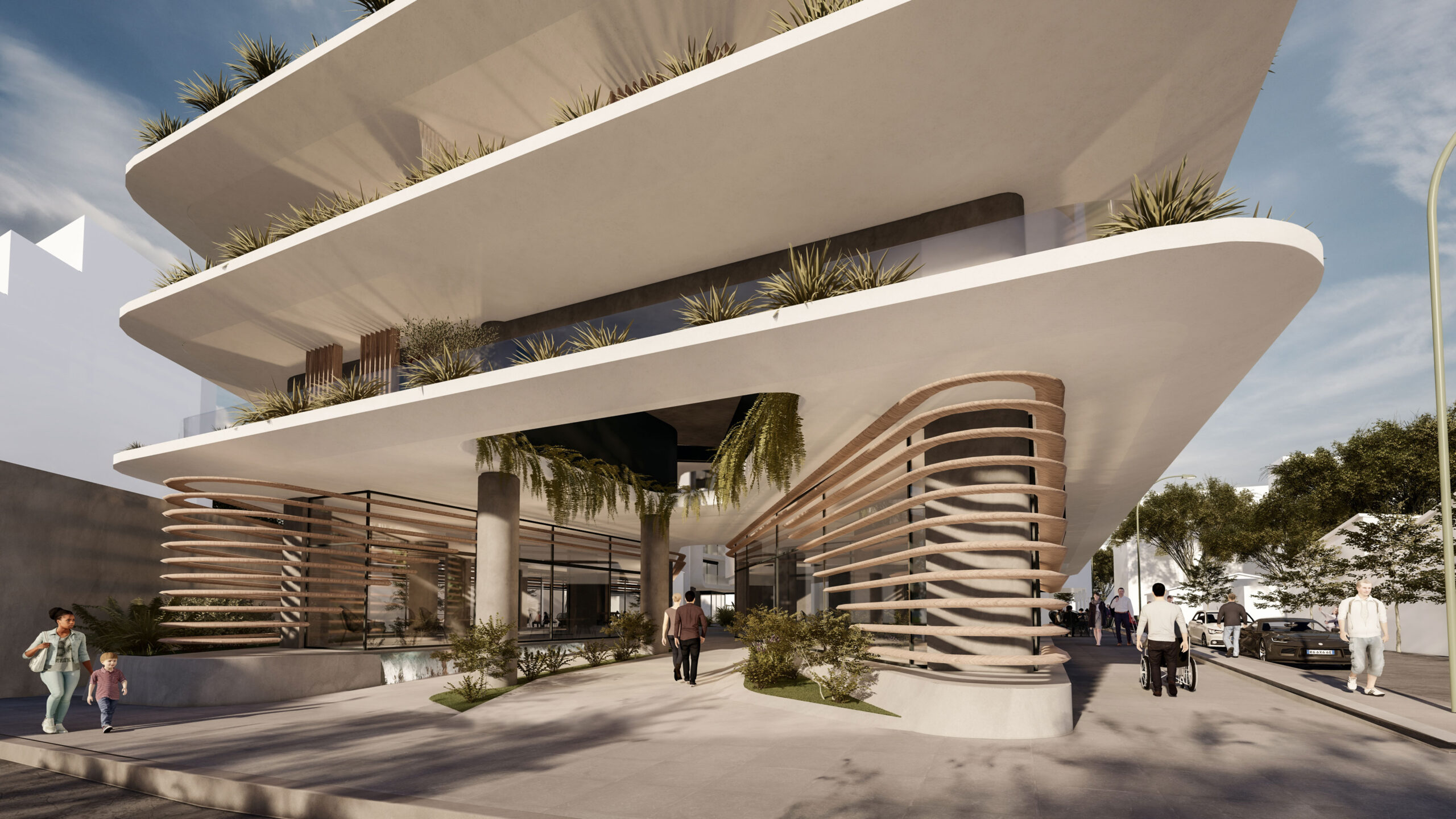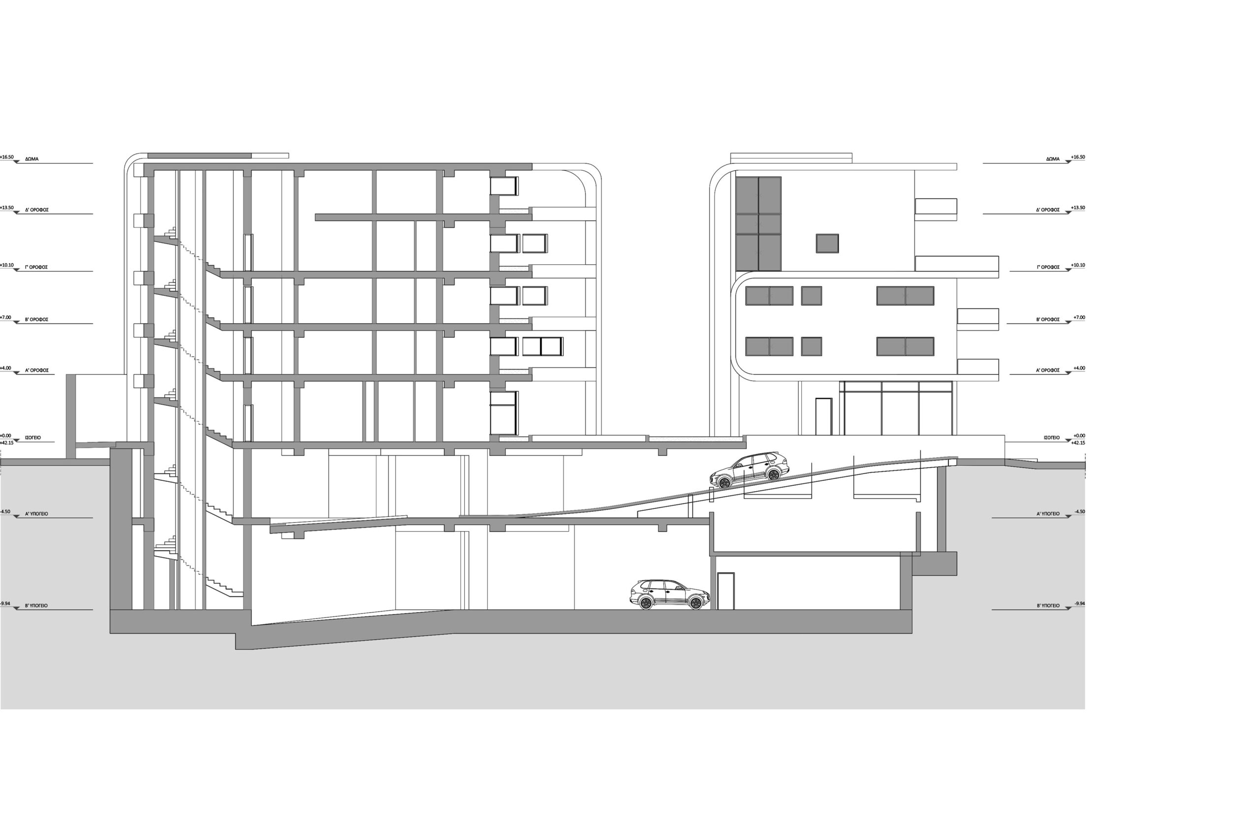 Οι κατοικίες συνυπάρχουν αρμονικά με την εμπορική δραστηριότητα, διαμορφώνοντας έναν πολυλειτουργικό πυρήνα. Ο συνδυασμός του δημόσιου και ιδιωτικού χώρου αποτυπώνεται σε μια συνεχώς μεταβαλλόμενη αλληλεπίδραση στον αστικό ιστό. Οι καμπύλες προσδίδουν μια φυσική, σχεδόν βιομορφική, ποιότητα στον χώρο, αποφεύγοντας τις ευθείες και τις αυστηρές γωνίες που συχνά περιορίζουν την αντίληψη της κίνησης. Πρόκειται ουσιαστικά,  για ένα κτήριο-πέρασμα.