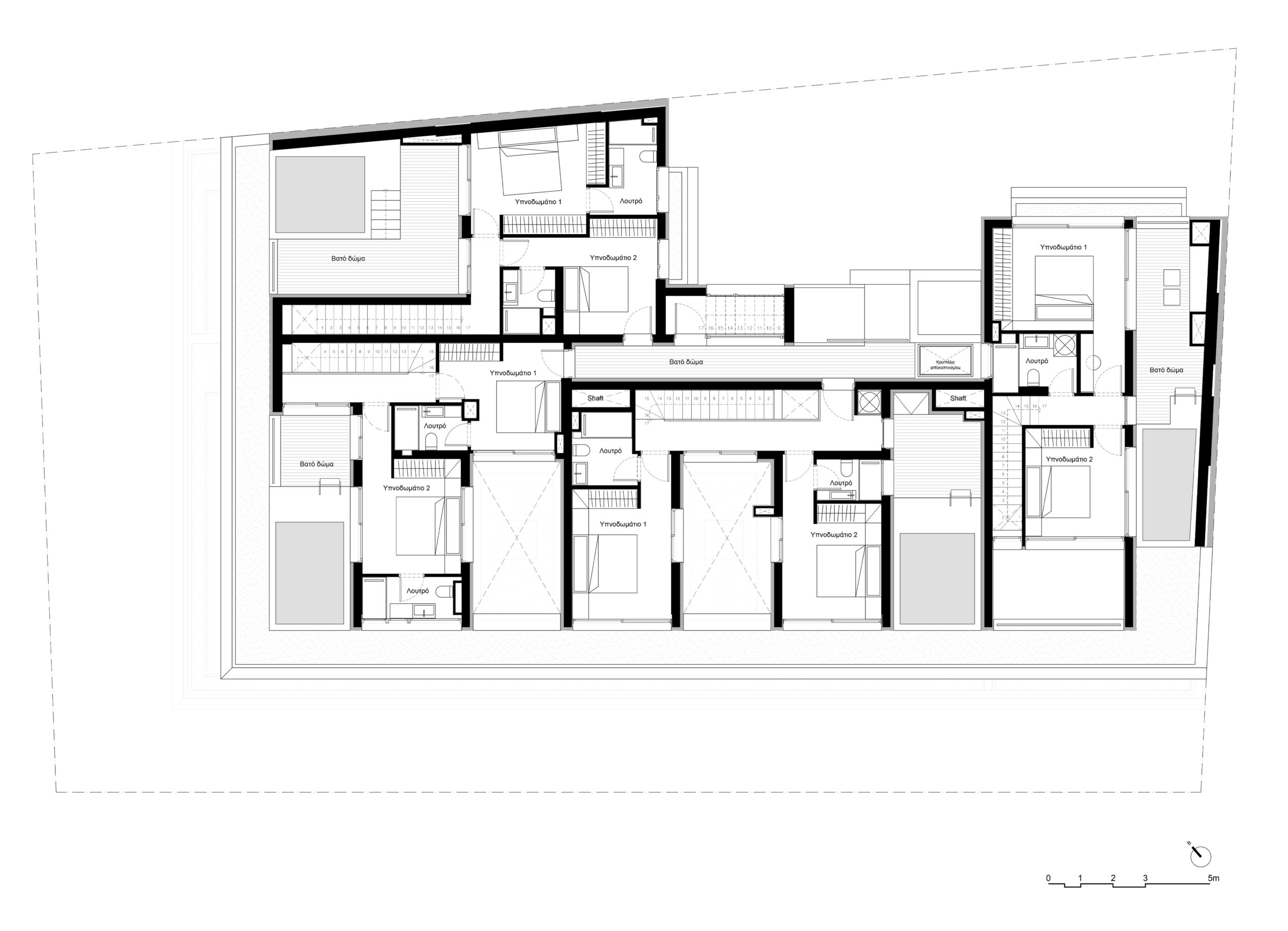 Οι εξώστες, τοποθετημένοι με ακρίβεια και αρμονική ισορροπία στην όψη, προσφέρουν χώρους επαφής με το φυσικό περιβάλλον, ενώ ταυτόχρονα ενσωματώνουν φυσικά στοιχεία μέσα στον αστικό ιστό, δημιουργώντας μια δυναμική αντίθεση με την αυστηρότητα της λευκής επιφάνειας. Πρόκειται για μια αναφορά στη φύση μέσα στην πόλη, που προσφέρει ζωή και ευεξία σε έναν αυστηρά τεχνοκρατικό κόσμο. Κάθε μονάδα αποτελείται από προσαρμοσμένα διαμερίσματα που ενσωματώνονται μεταξύ τους, με σκοπό την μεγιστοποίηση της χωρικής χρηστικότητας και την οπτική συνέχεια μεταξύ των επιμέρους χώρων.