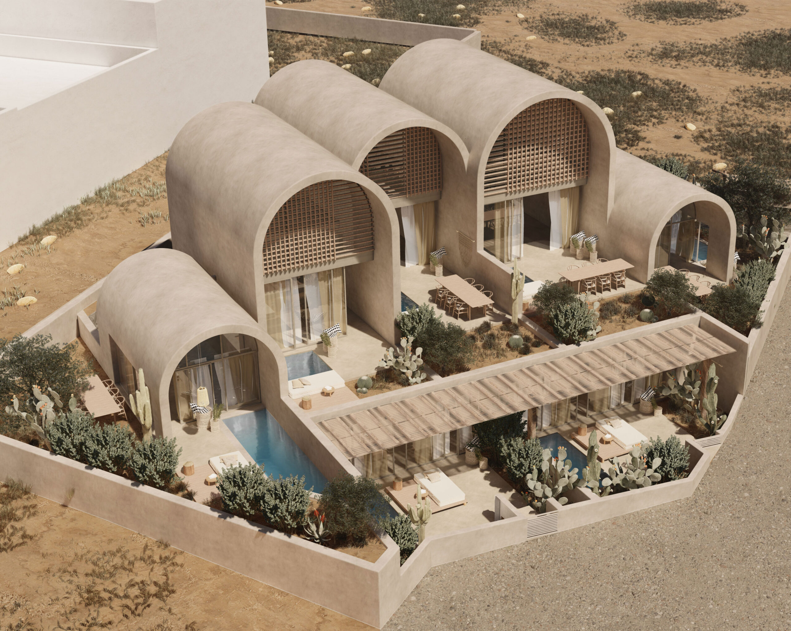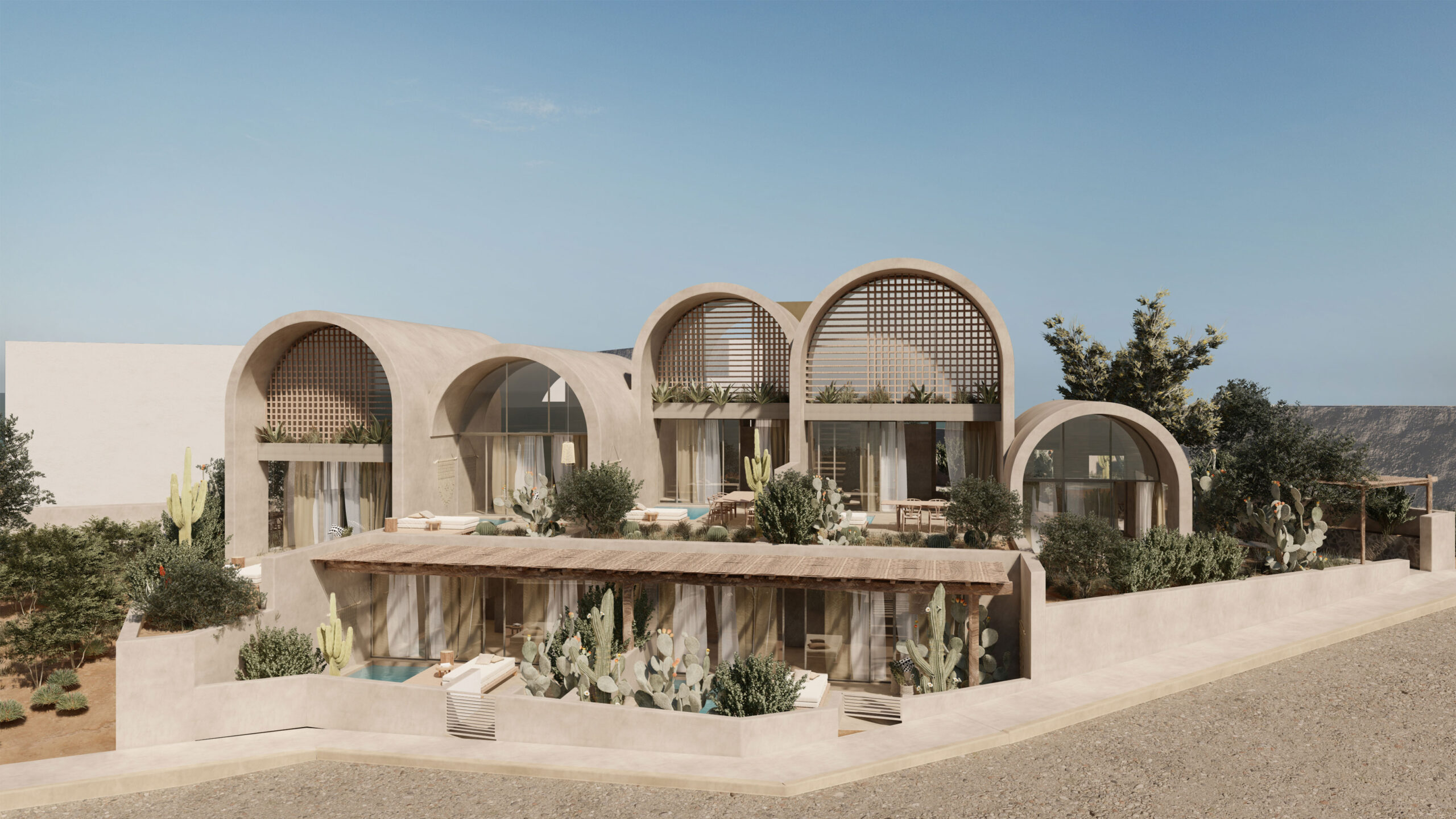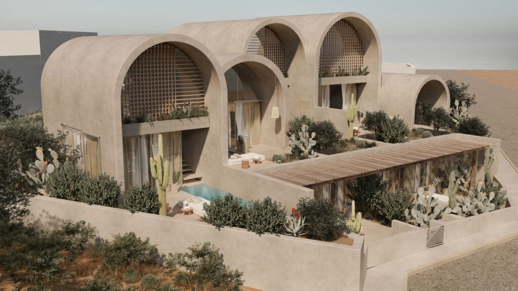 Inspired by the genuine Cycladic tradition and the timeless connection of the donkey with the history of Santorini, the hotel “Onos” (original Greek: donkey) is harmoniously integrated into the landscape of Monolithos, adopting a gentle, almost primitive architectural expression. The materiality of the space is drawn from the local land, with earthy tones smeared on the walls to reflect the volcanic relief and natural tones of the island, while the domes and curved surfaces bring back the sense of traditional construction, creating spaces that breathe through light and shadow. The composition of the volumes is shaped by a simple, almost primitive geometry, where the monumentality of the building remains subliminal, expressed through the plasticity of the forms and the synergy with the landscape. Natural materials, such as volcanic stone and wood, intertwine with the smooth surfaces of the plaster, creating an architecture that does not compete with nature, but enhances it with delicacy and respect.At Onos, the experience of hospitality is inextricably linked to the built environment, where the flow of spaces and the quality of light create a sense of absolute tranquility. Its architecture does not seek to impose, but to assimilate into the landscape, offering guests an experience of the land and light of Santorini.