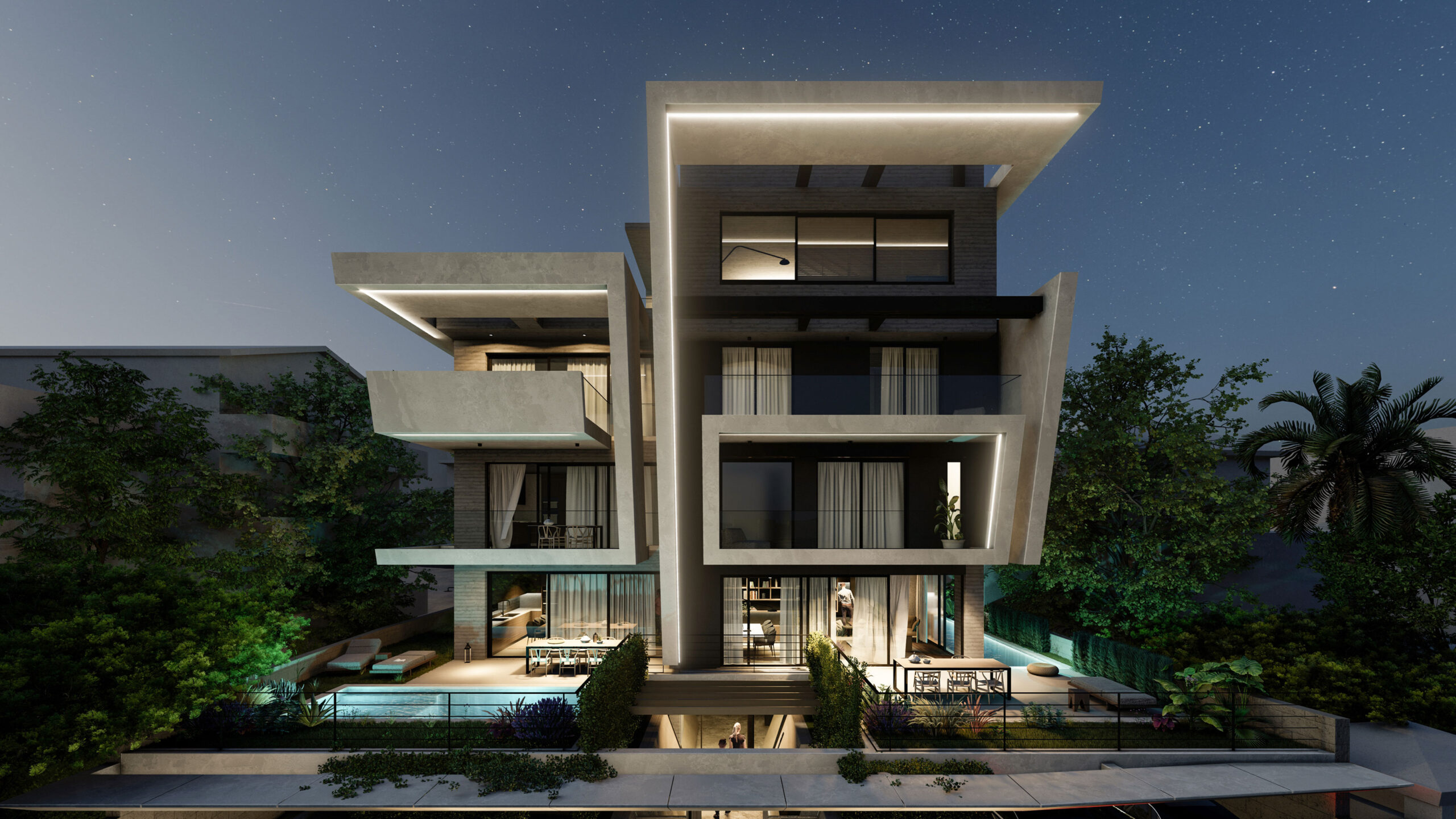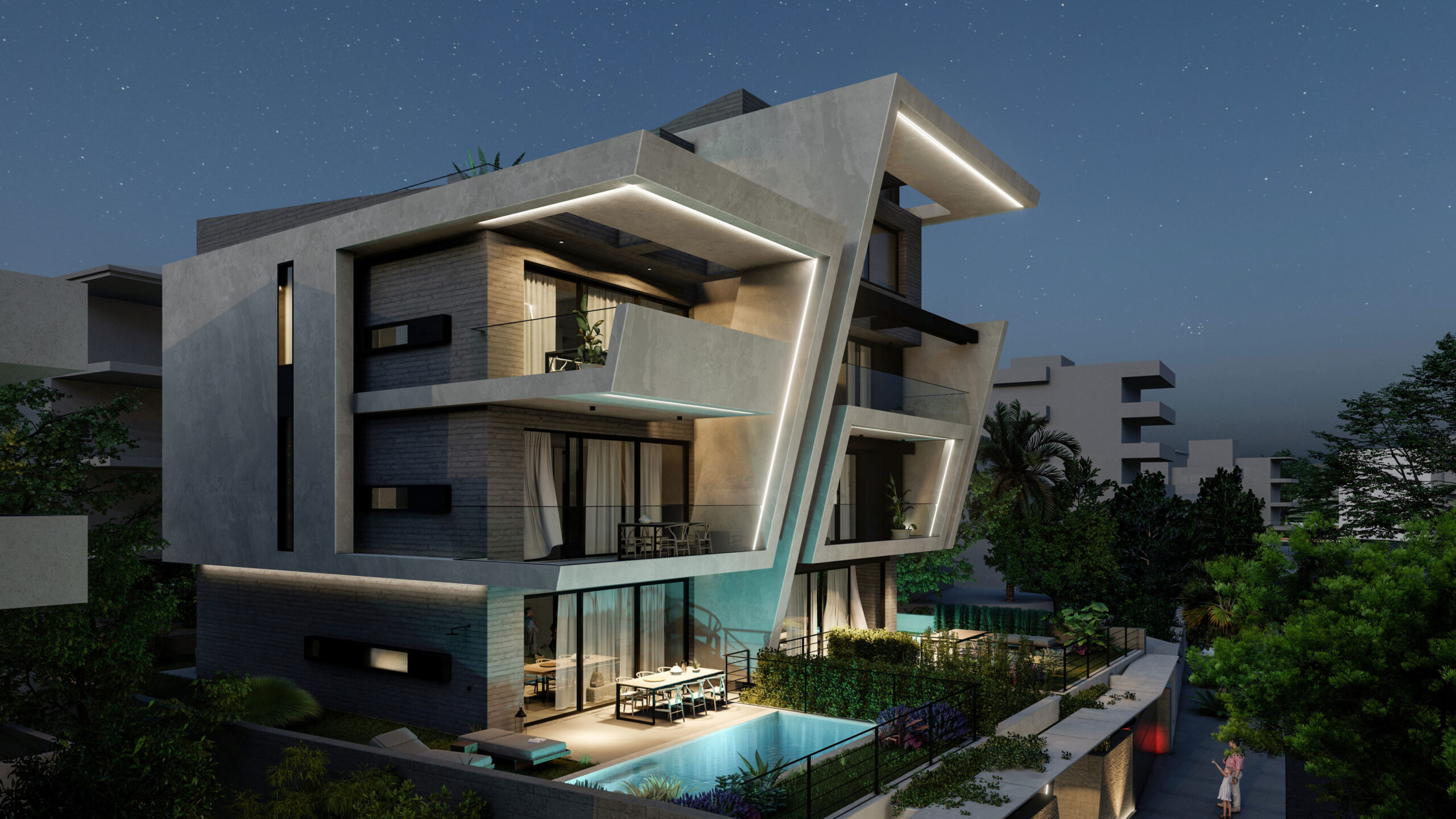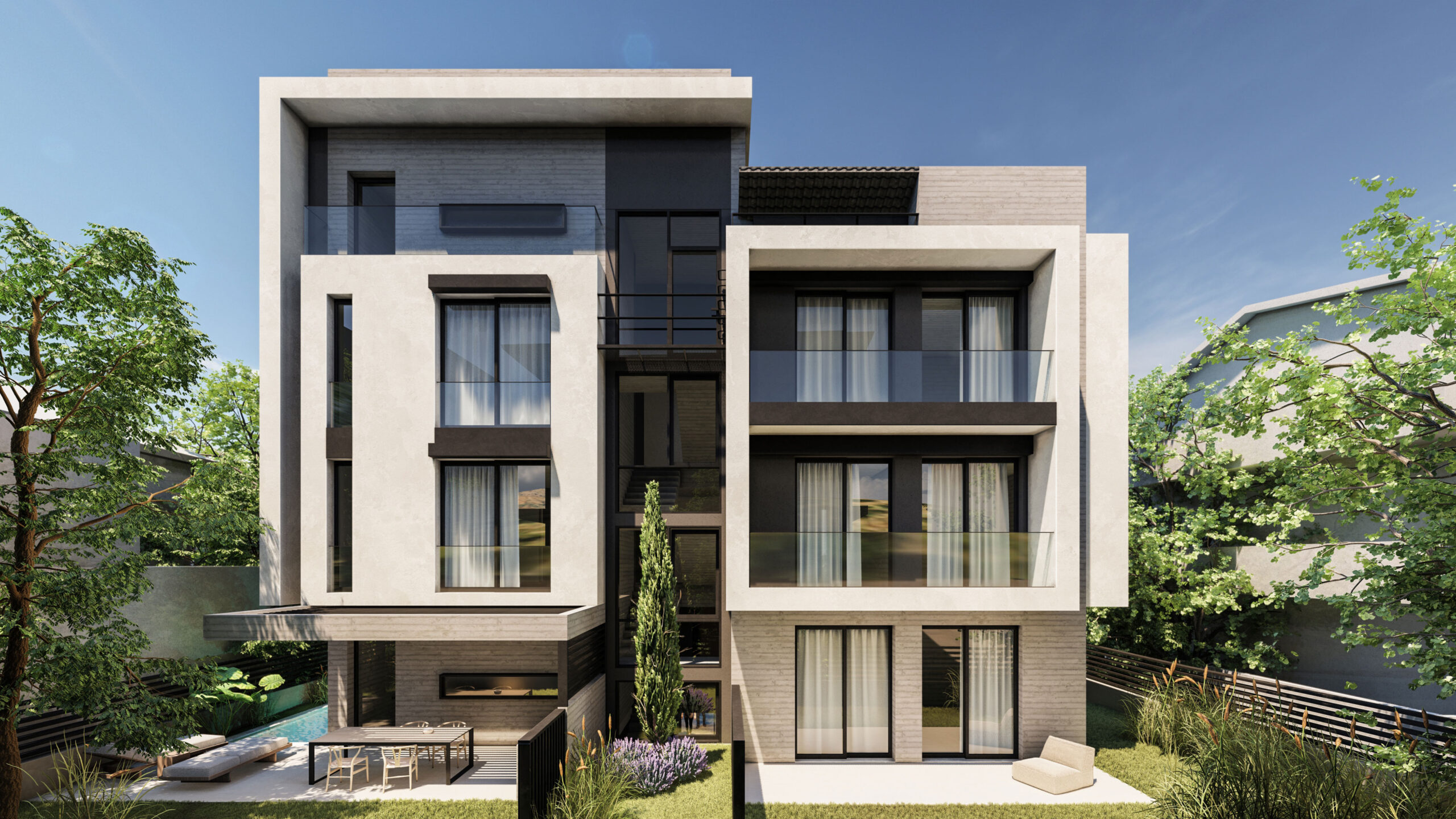 This contrast is also reinforced by the vertical elements emerging in the building, which create a sense of upward movement, reinforcing the idea of rebirth and ongoing evolution. The imaginary union of the earthly and the heavenly. These elements, reminiscent of the defensive lines of ancient Mycenaean architecture, are linked to the notion of protection and strength, being at the same time a symbol of timeless resilience and a modern monumental imposingness.