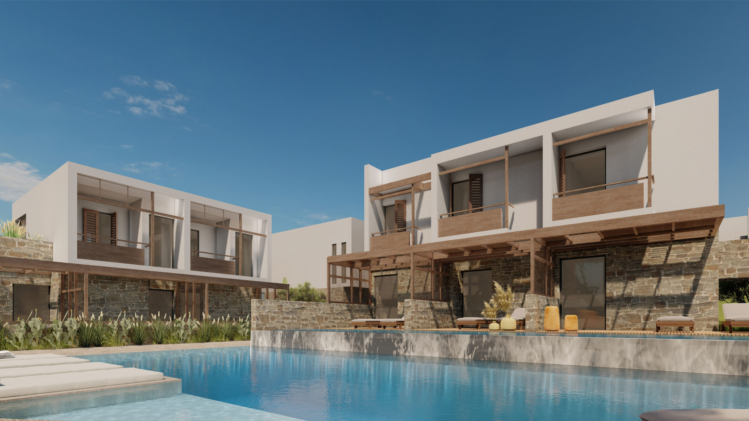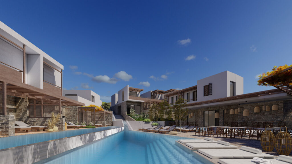 The hotel “Pnoe Village” in Paros combines in a unique way the traditional Cycladic architecture with modern elements, offering an authentic and at the same time sophisticated hospitality experience. Built with respect to the local tradition, the hotel uses natural materials such as wood and stone, incorporating them into the modern architectural lines and the minimal aesthetics of the space. The combination of these materials creates a warm and welcoming atmosphere that harmonizes perfectly with the natural landscape of the island.