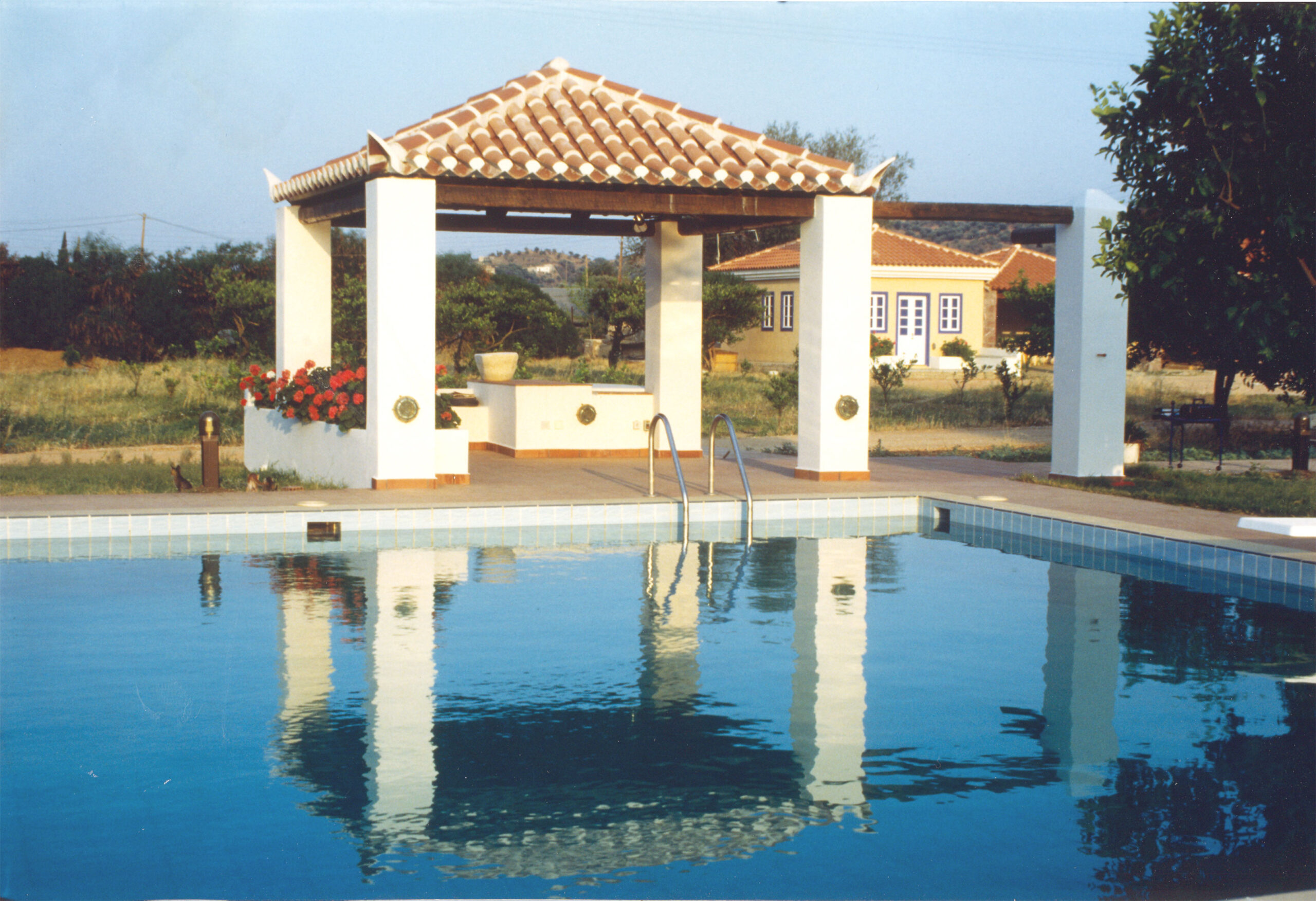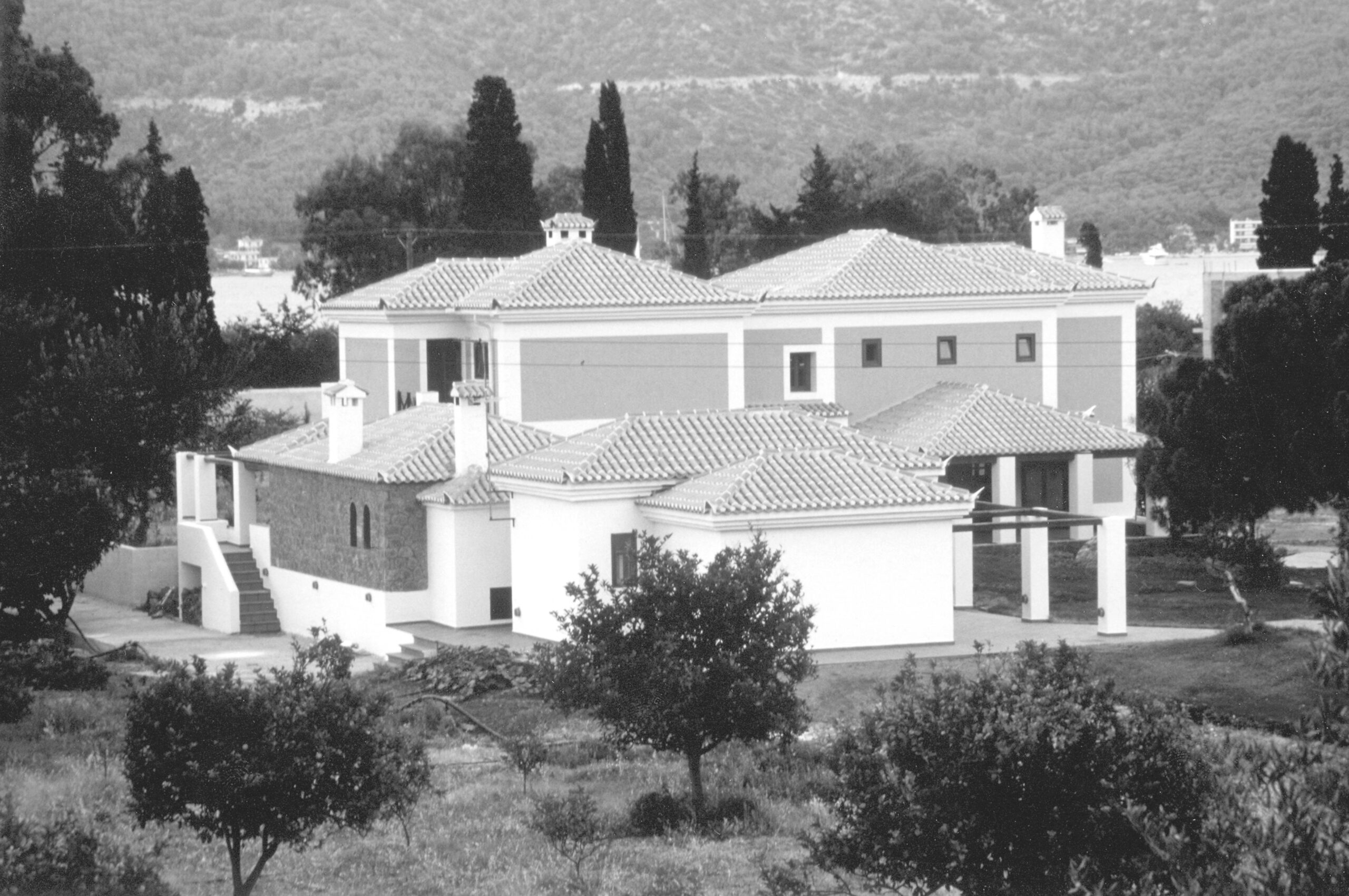 The residence “Summer House” in Galata Troizinia combines in a unique way the traditional neoclassical style with a timeless view of modern architecture. The design of the house is inspired by the Greek architecture of the 20th century, but without imitating it uncritically, exuding elegance and magnificence. The use of stone in the interior enhances the sense of intimacy, while the traditional style is reflected in the elegant proportions and decorative elements of the facade. The interior of the villa is distinguished for its spacious layout and the excellent relationship between the interiors. The canopy and the swimming pool offer an extra dimension to the space, creating an exceptional outdoor area that combines comfort with magnificent views. Its strategic location offers panoramic views of the surrounding landscape, creating an ideal spot for relaxation and enjoyment, while the canopy protects from the sun, allowing residents to enjoy the outdoor space all year round. The outdoor spaces are designed to blend harmoniously into the natural landscape, with simple lines and lovely greenery. This residence provides the comforts and elegance of modern living, in perfect harmony with the natural environment.