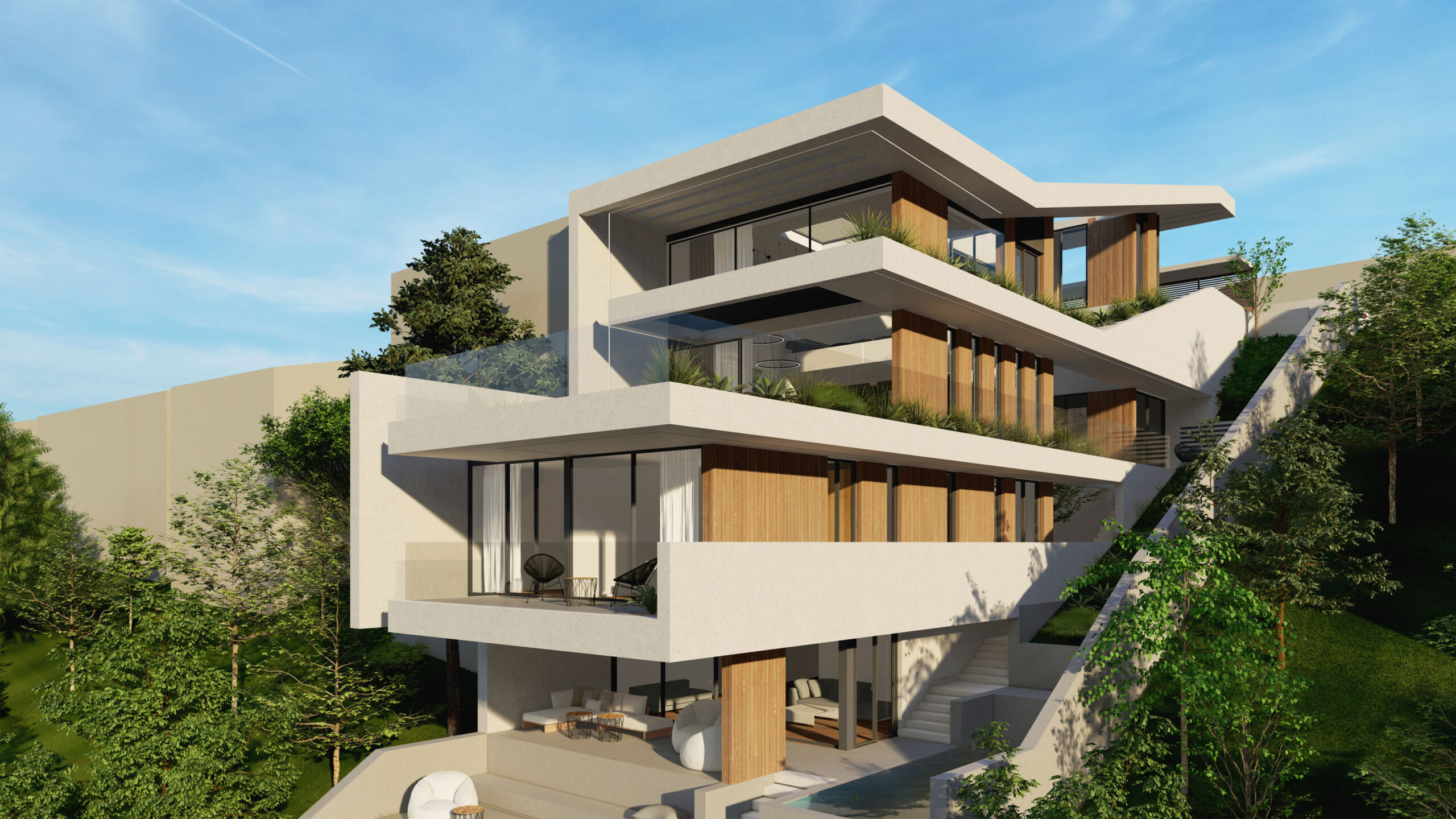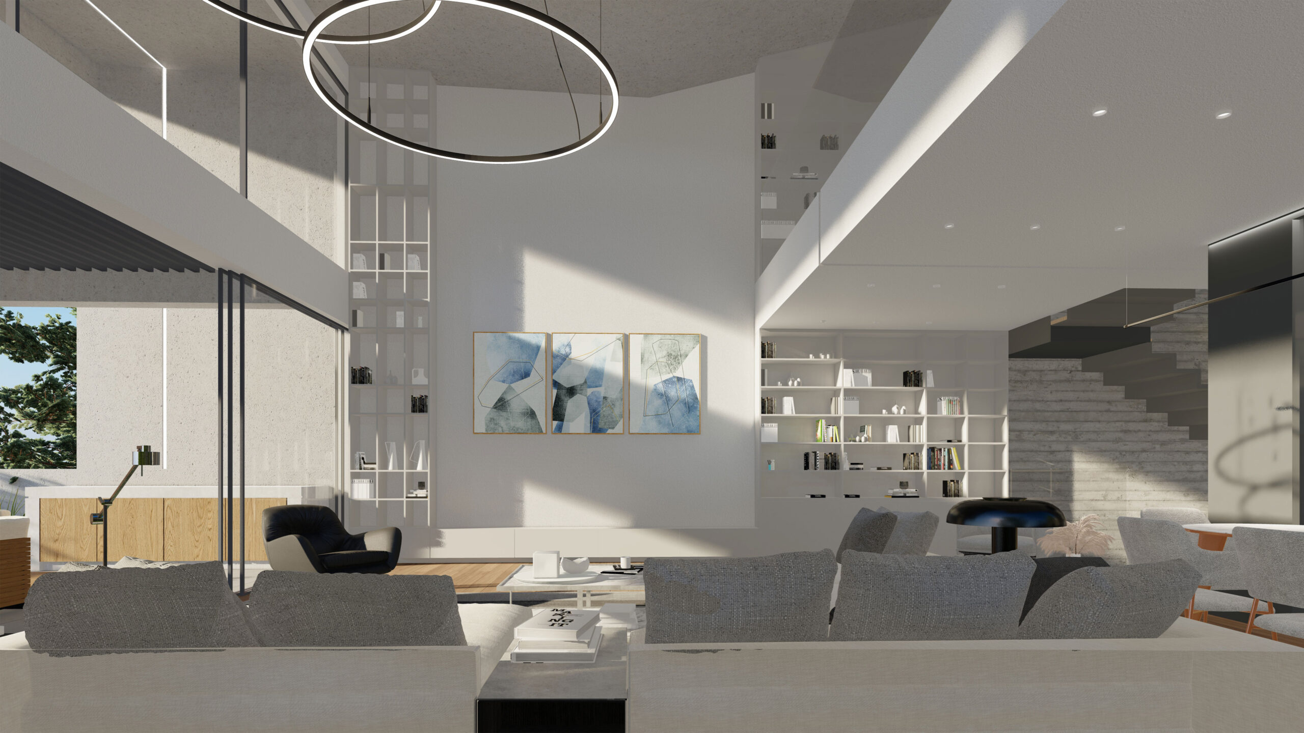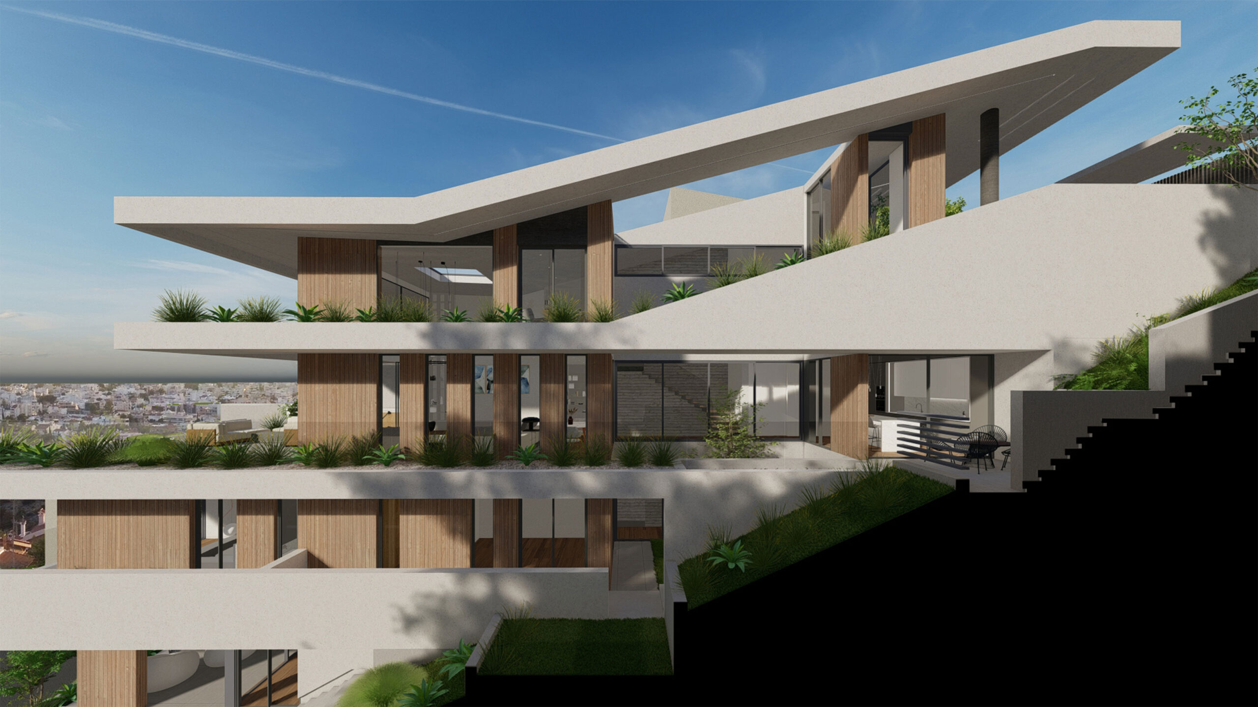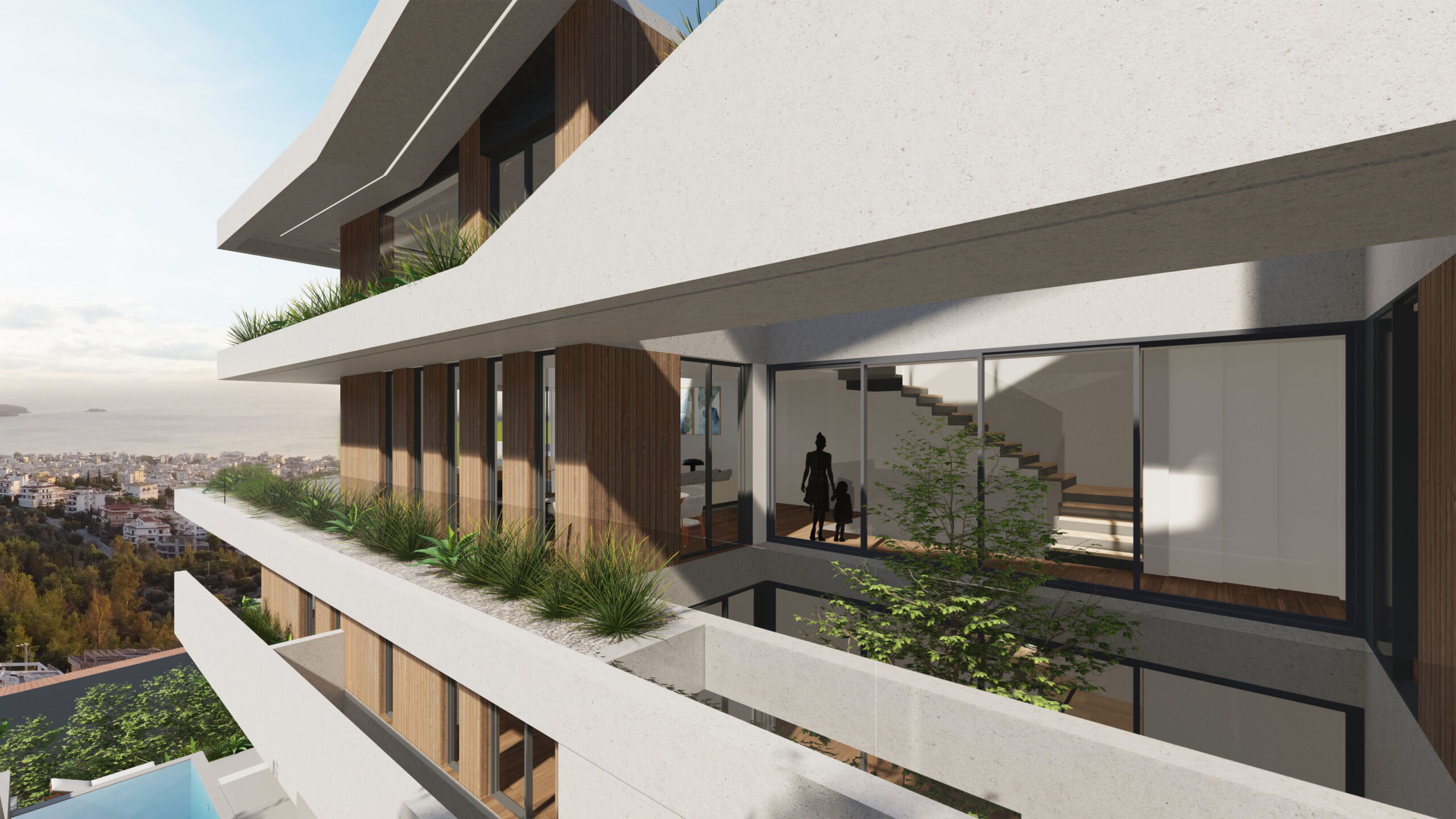 On a plot of land in Voula with a steep slope, a modern residence is created that meets modern material and energy technologies, constituting a landmark building for the area. The plot itself and the topography dictates the 4 different levels as if emerging from the rock. The large balconies and open spaces take advantage of the panoramic sea views