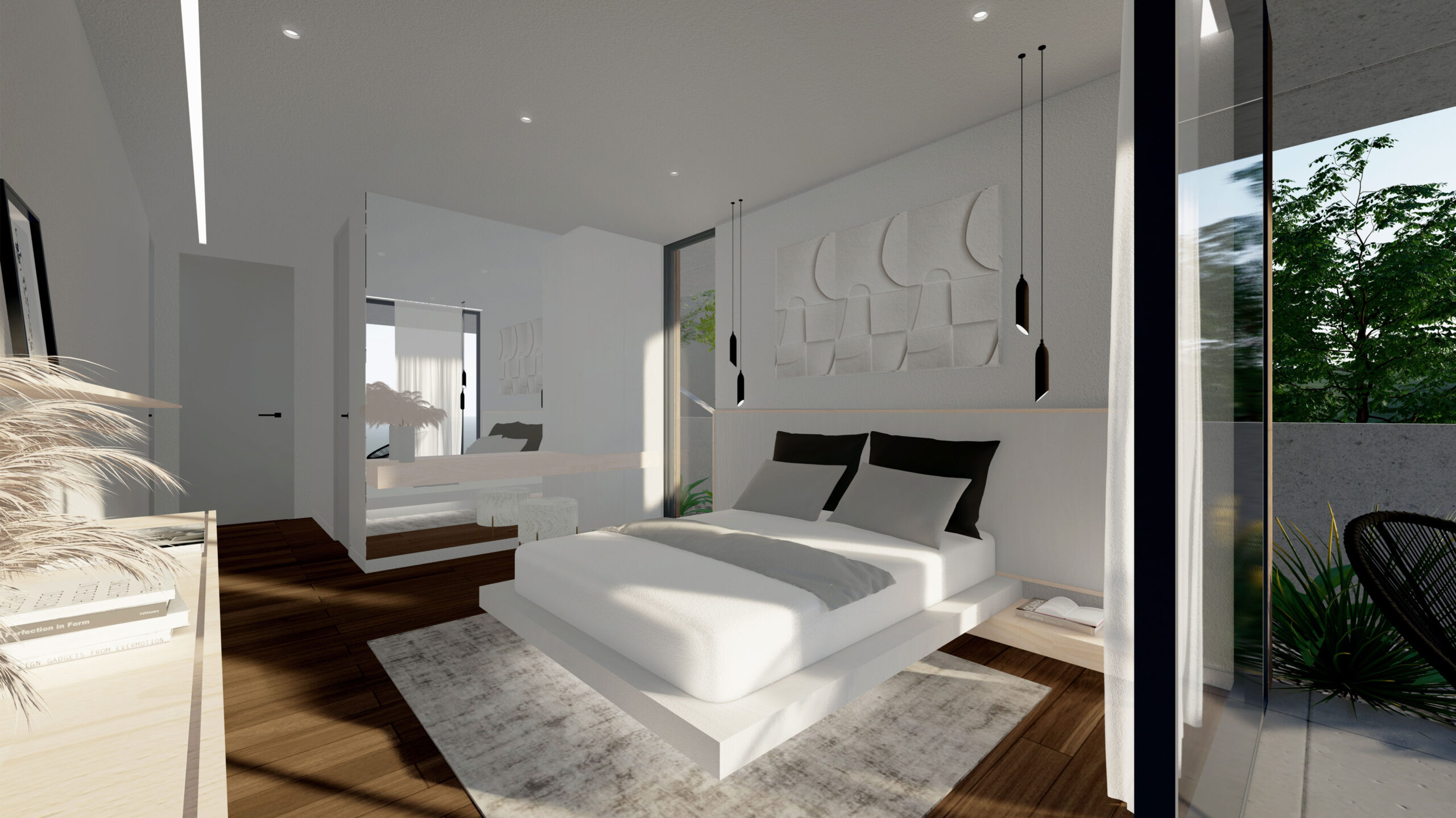 The house is developed linearly from the North, where the entrance and utility rooms are located, to the South where the two-room living spaces and the balconies are located. The elongated east elevation is left free towards the planted open space of the plot, while the solid mid-wall on the west elevation protects the house from the unfavourable western orientation. The optimum use of the orientation and data of the plot, through the design, creates an environment of comfortable and pleasant living for the users of the house.