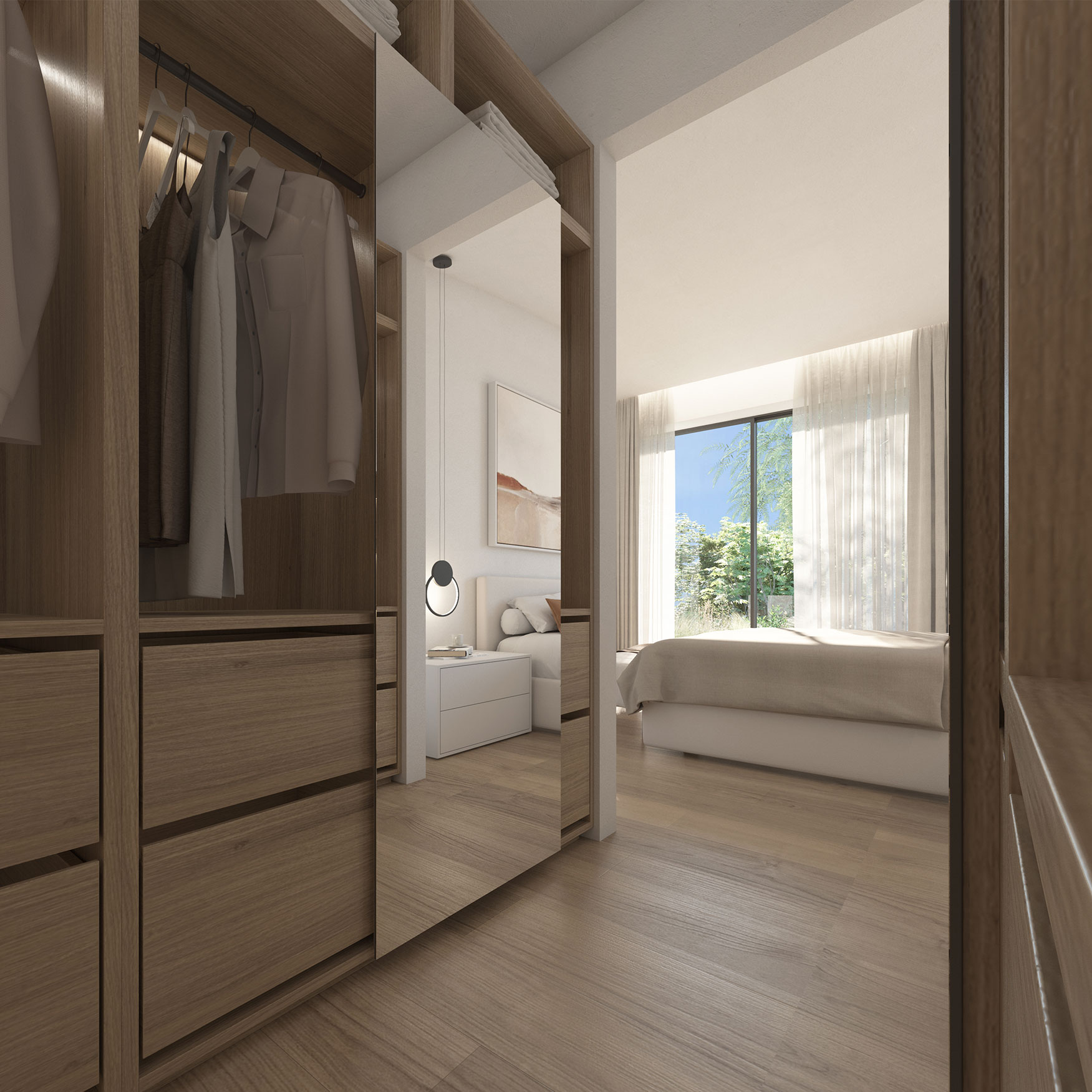 In contrast, the other side of “The Pure” reveals a sense of “veil” through the white blinds, which fall softly like diffused light, protecting the interior rooms while allowing natural light to gently penetrate the space. This constant interplay between light and shadow creates a sense of calm and rest without compromising the integrity of the whole.