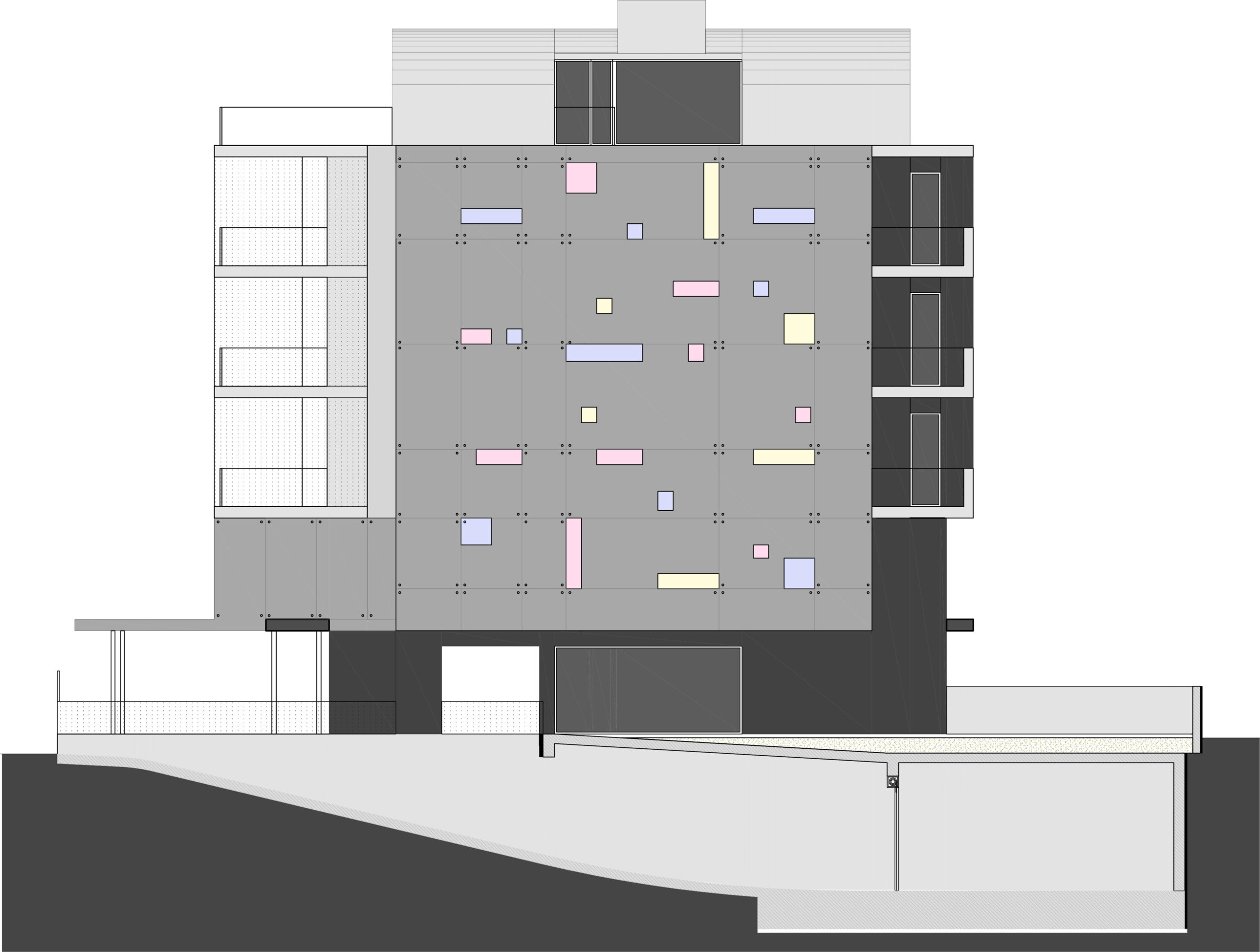The appearance of the building exudes a sense of the unconventional that refuses to succumb to conventional aesthetic imperatives. On one side, the building conceals a blind wall with strict geometric lines, squares and rectangular shapes that stand undistinguished, undistinguished, undecorated. This surface of the building functions as a dominant surface, free of any spatially charged perception, emphasizing the solidity and moral precision of design and geometry.
