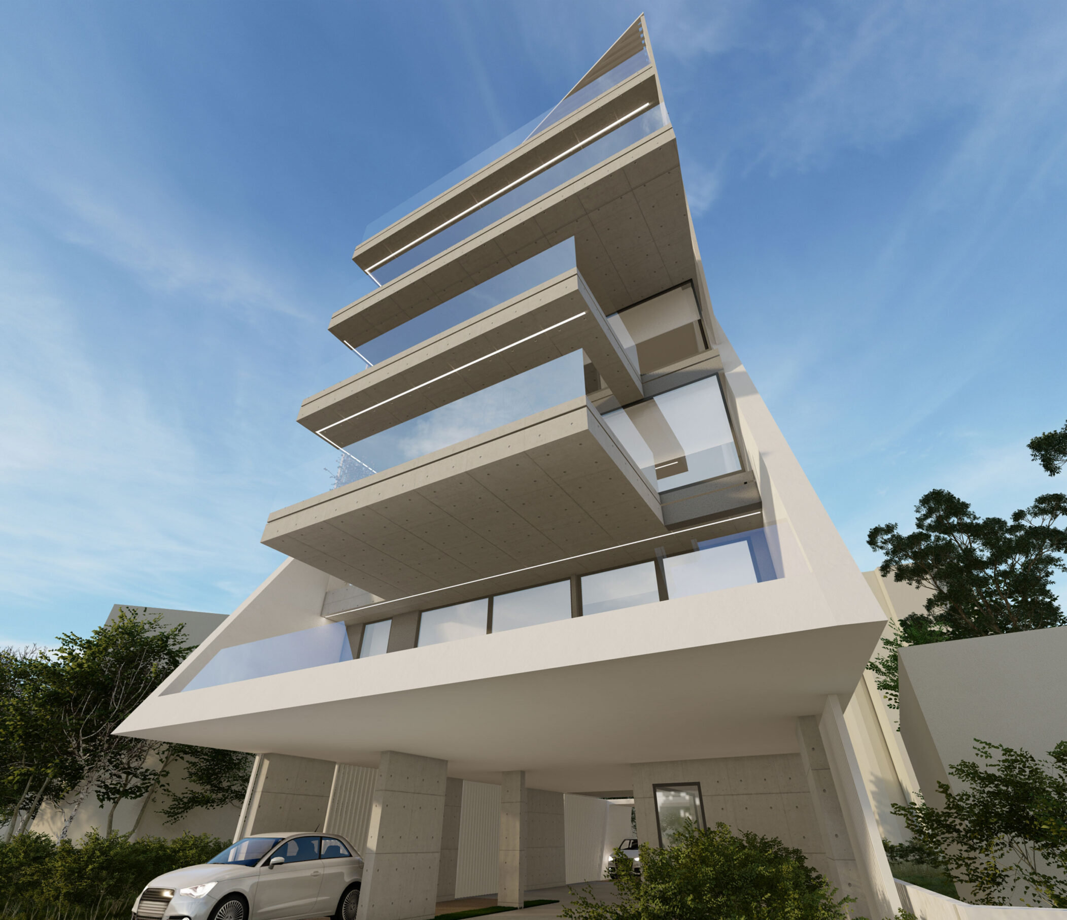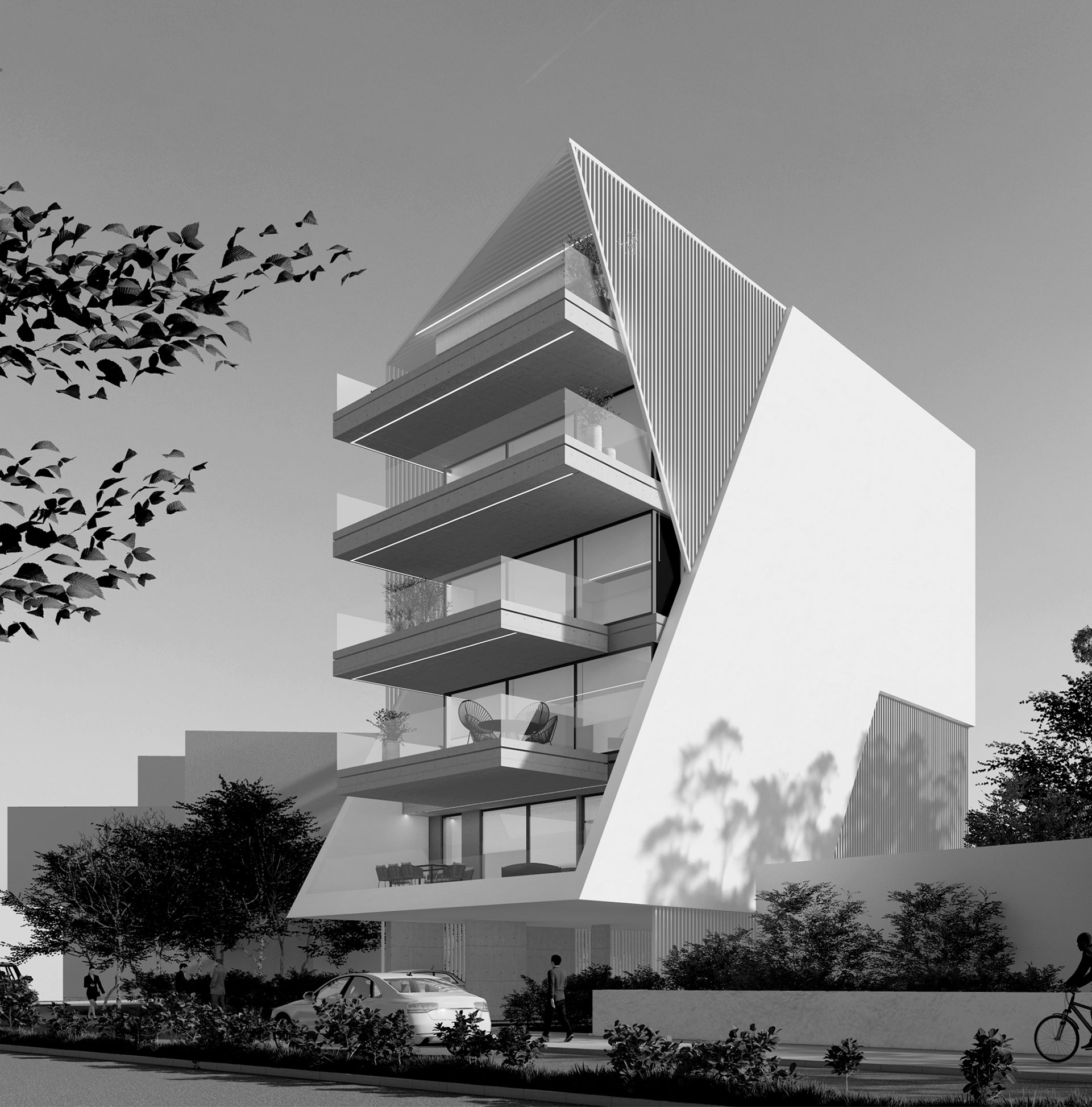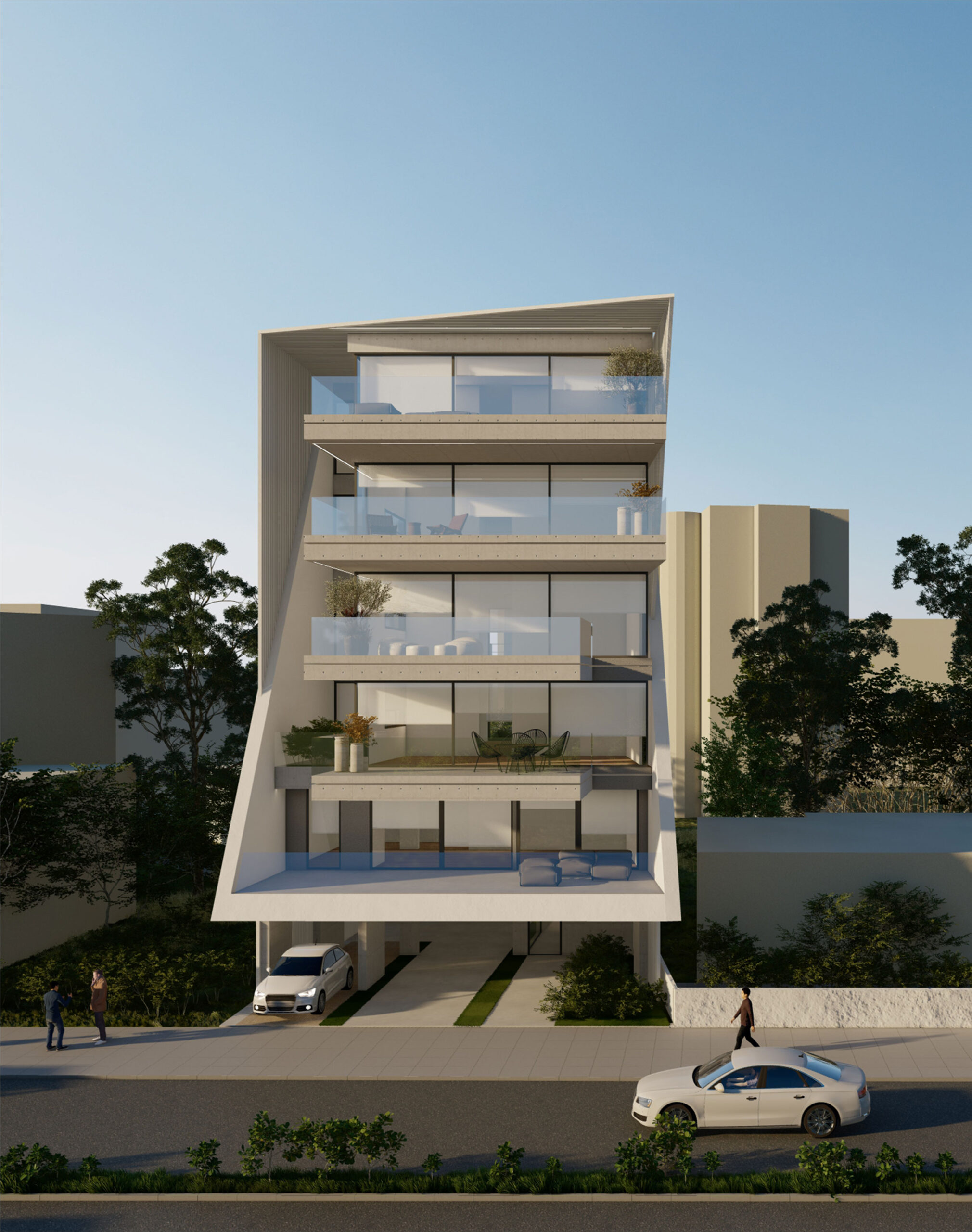 The apartment building in Trikala reflects a bold architectural proposal, where the geometry seems to have undergone a clean, precise cut, as if it had been cut by a blade. The volumes are deconstructed through sharp cuts and sharp angles, creating the sense of an architecture that is formed through its own deconstruction. Surfaces are cut with surgical precision, intensifying the dramatic interplay between light and shadow, while asymmetrical etchings at the boundaries of the composition create a dynamic that brings the building into constant interaction with its surroundings.The cut edges of the volumes reveal interior spaces through slits and deeply embedded openings, offering moments of sudden transparency within the solid mass of the structure. The materials, exposed concrete, metal details and dark glassy elements, enhance the sense of an architecture that seems to balance precision and raw power. The geometric rigour of the building is juxtaposed with the fluidity of natural light, which penetrates the intersections, deconstructing hard lines and creating an alternating experience of space.This apartment building is a sculptural intervention in the urban fabric of Trikala. Its bold morphology dictates a new approach to habitation, where the very act of shearing becomes a design tool, revealing new possibilities of interaction between building, light and human experience.