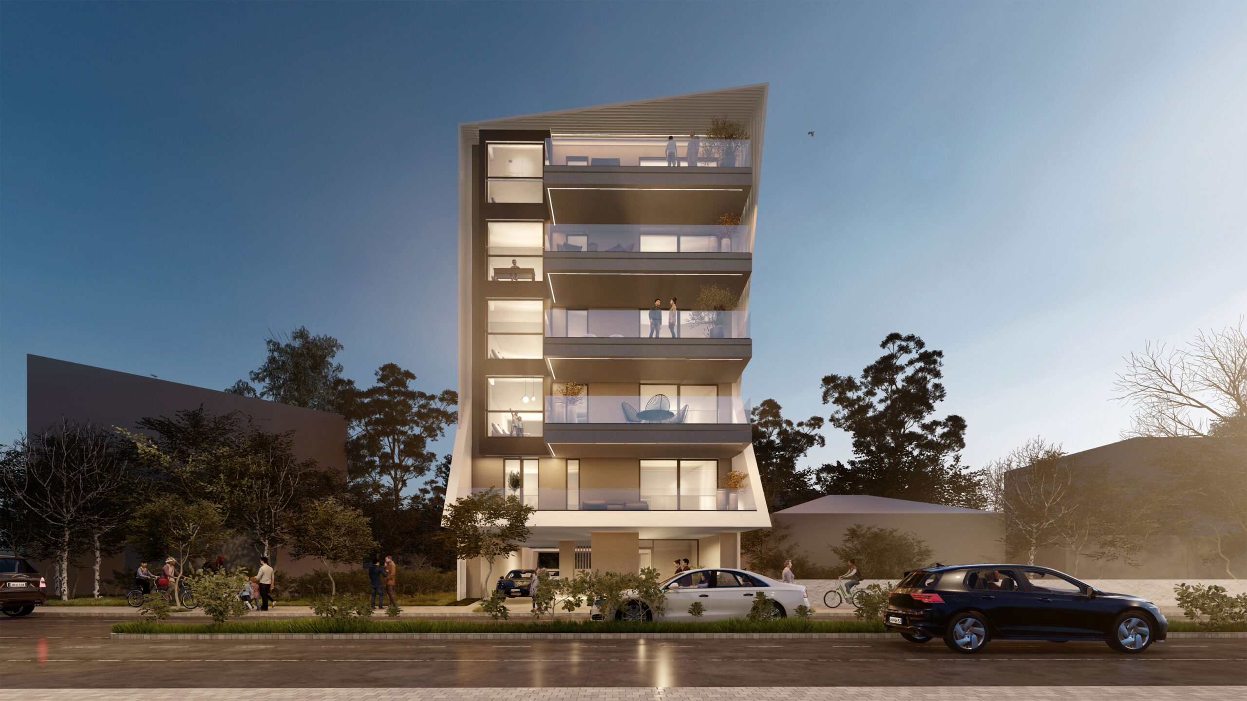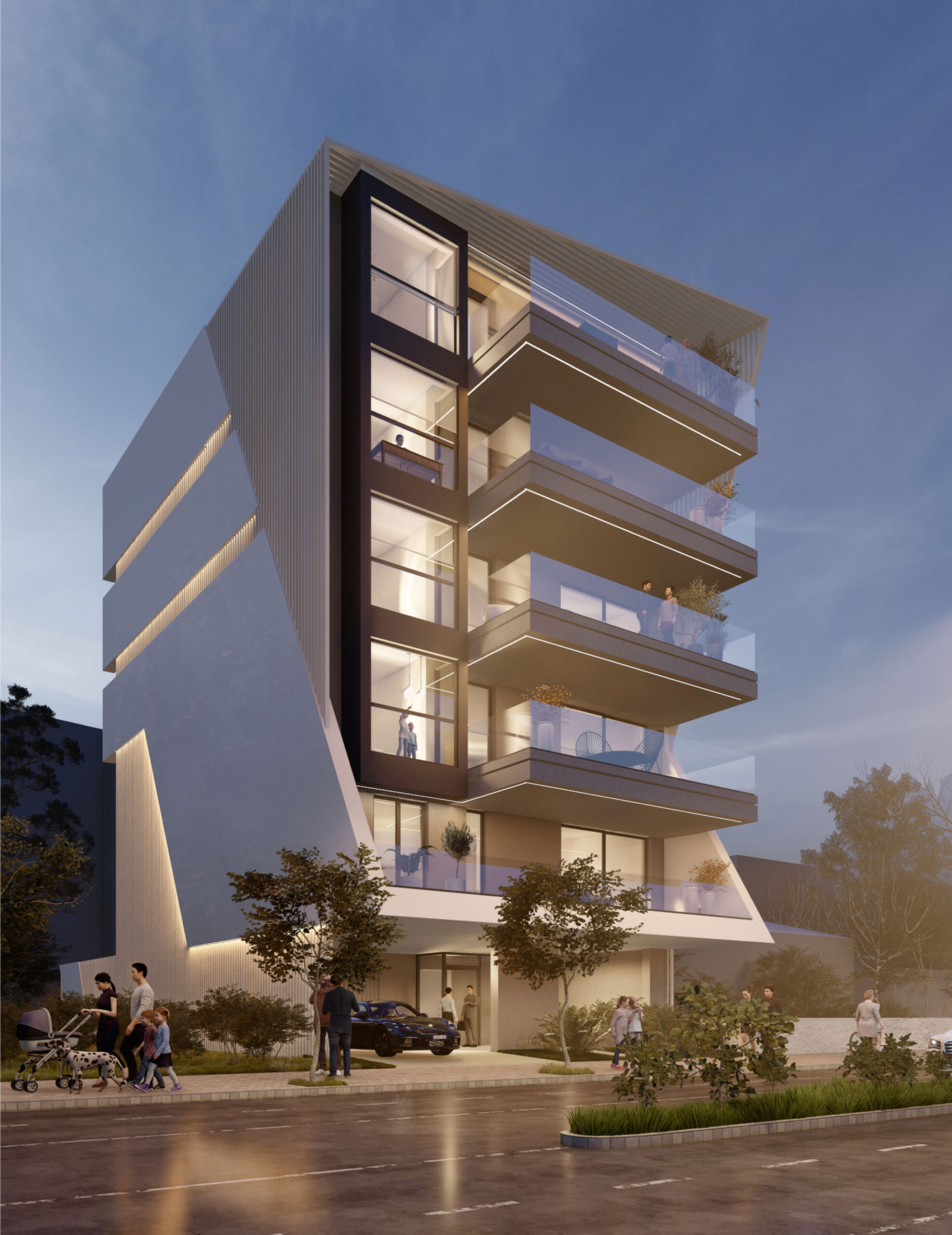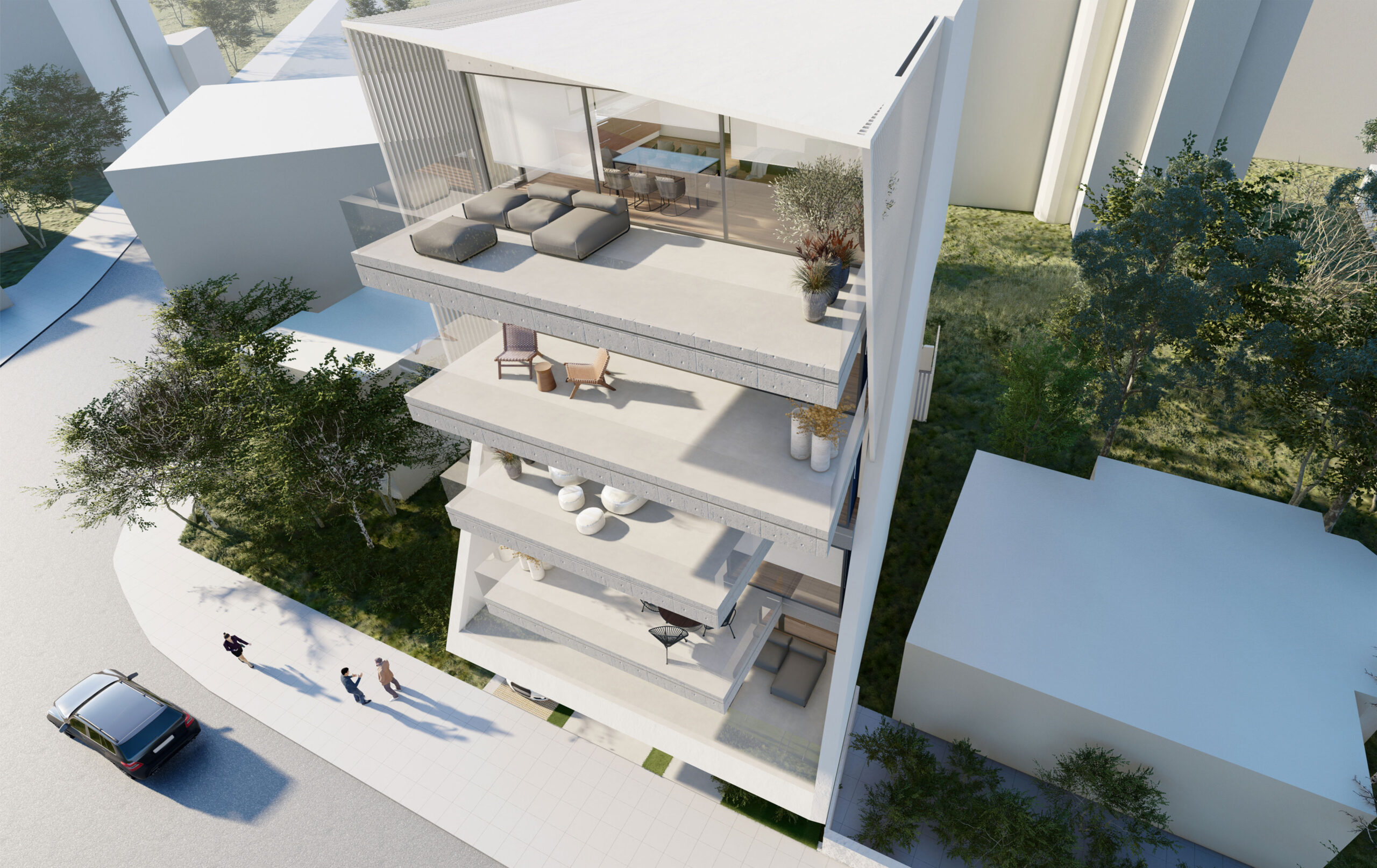 The apartment building in Trikala reflects a bold architectural proposal, where the geometry seems to have undergone a clean, precise cut, as if it had been cut by a blade. The volumes are deconstructed through sharp cuts and sharp angles, creating the sense of an architecture that is formed through its own deconstruction. Surfaces are cut with surgical precision, intensifying the dramatic interplay between light and shadow, while asymmetrical etchings at the boundaries of the composition create a dynamic that brings the building into constant interaction with its surroundings.The cut edges of the volumes reveal interior spaces through slits and deeply embedded openings, offering moments of sudden transparency within the solid mass of the structure. The materials, exposed concrete, metal details and dark glassy elements, enhance the sense of an architecture that seems to balance precision and raw power. The geometric rigour of the building is juxtaposed with the fluidity of natural light, which penetrates the intersections, deconstructing hard lines and creating an alternating experience of space.This apartment building is a sculptural intervention in the urban fabric of Trikala. Its bold morphology dictates a new approach to habitation, where the very act of shearing becomes a design tool, revealing new possibilities of interaction between building, light and human experience.
