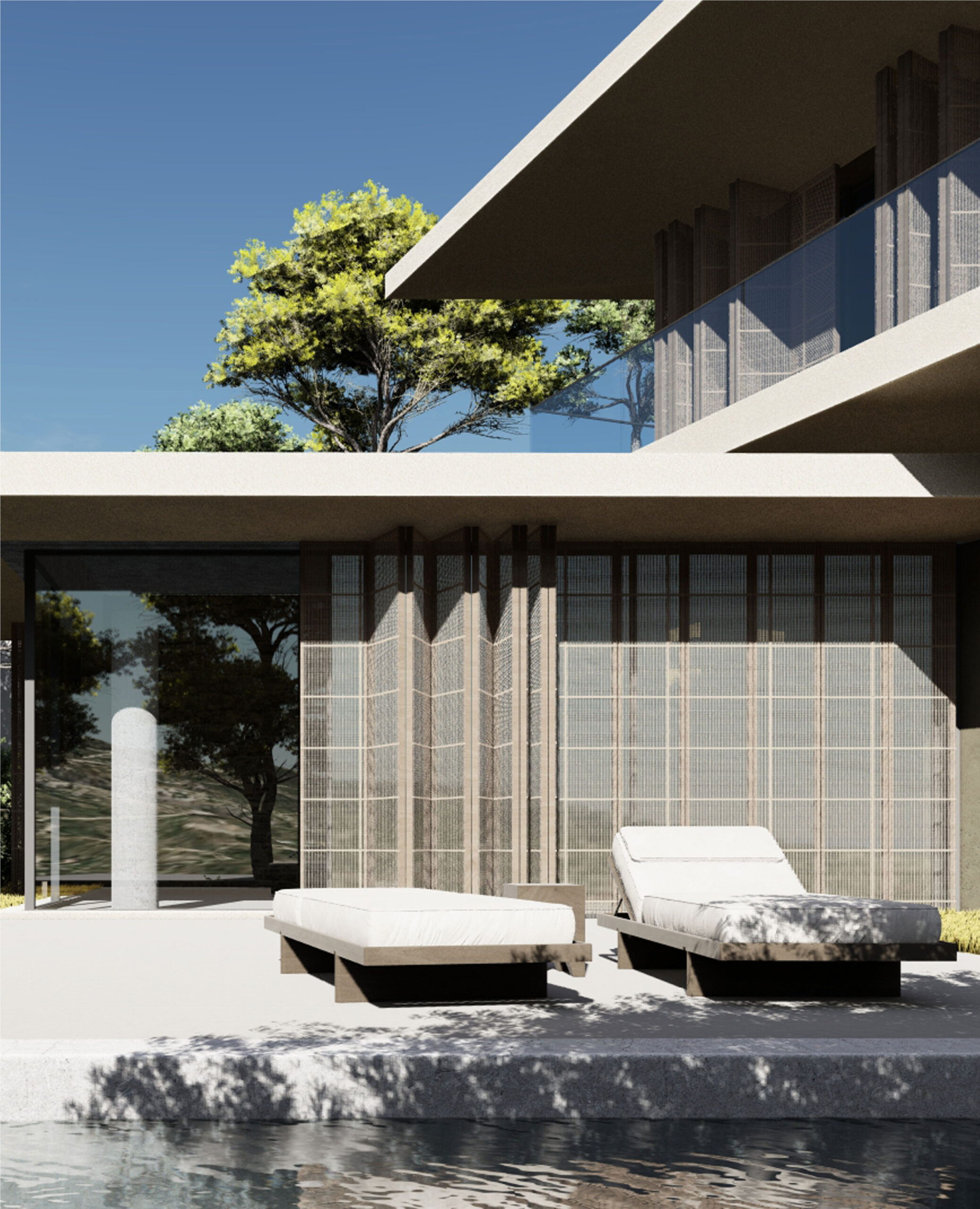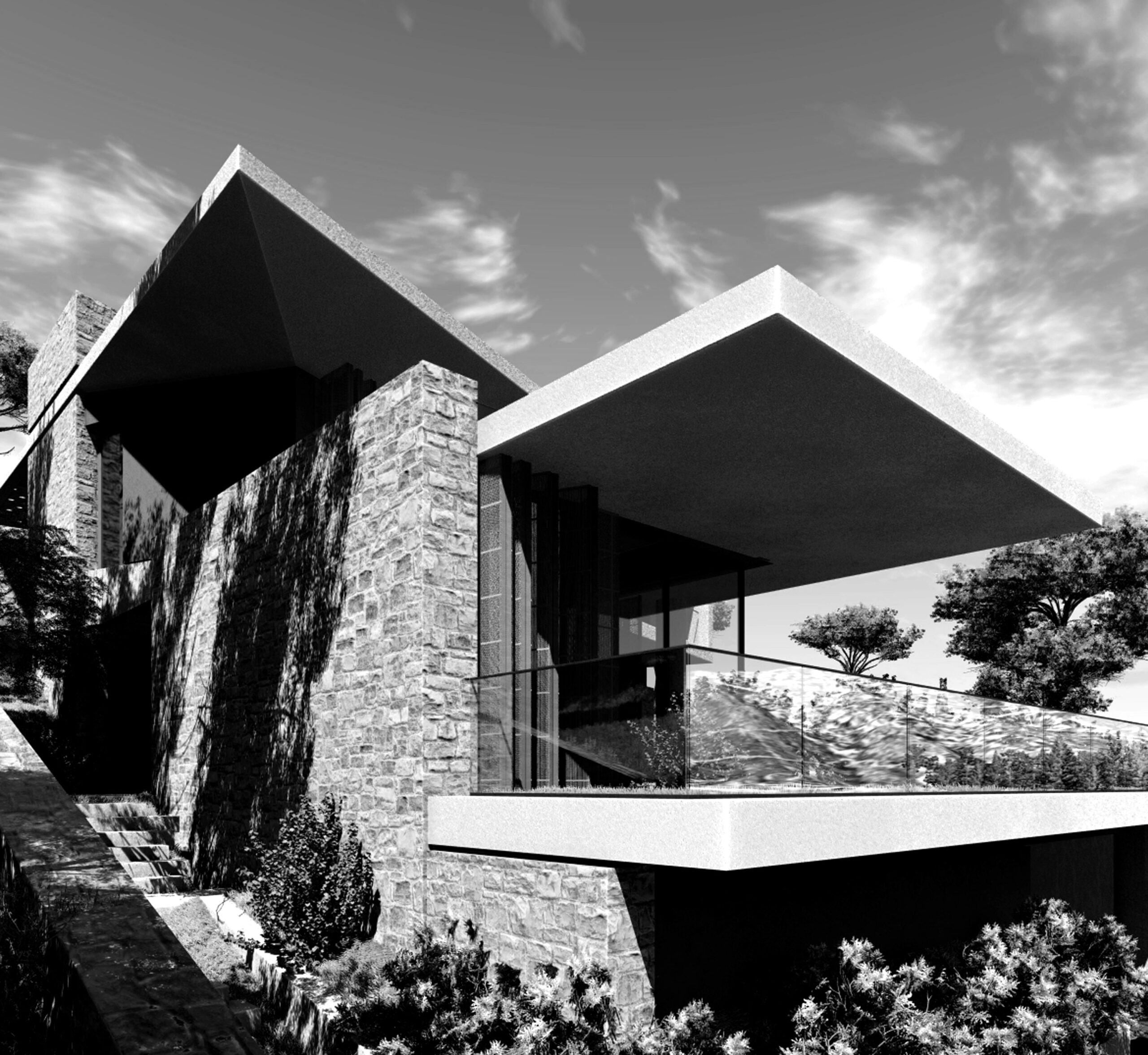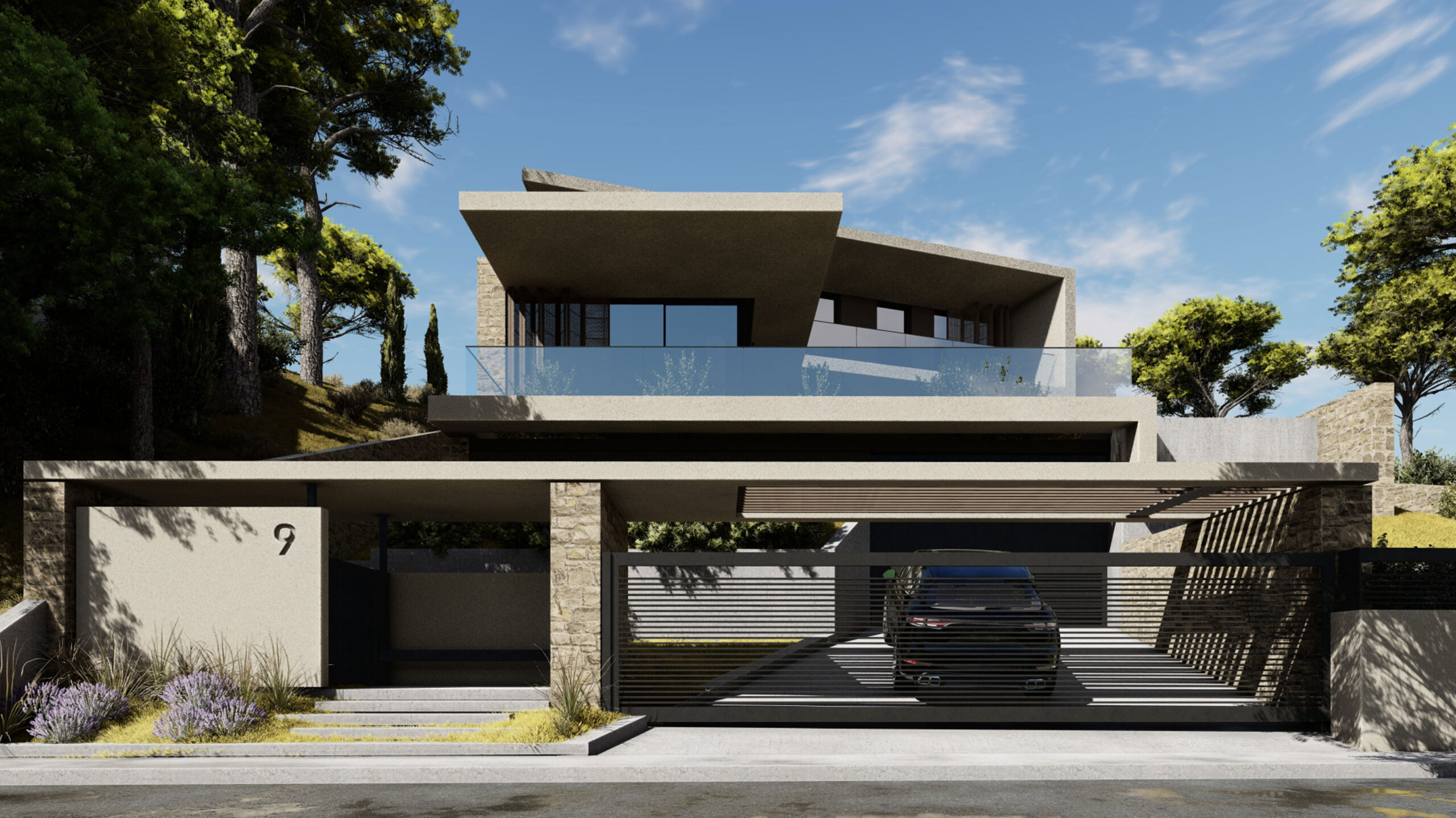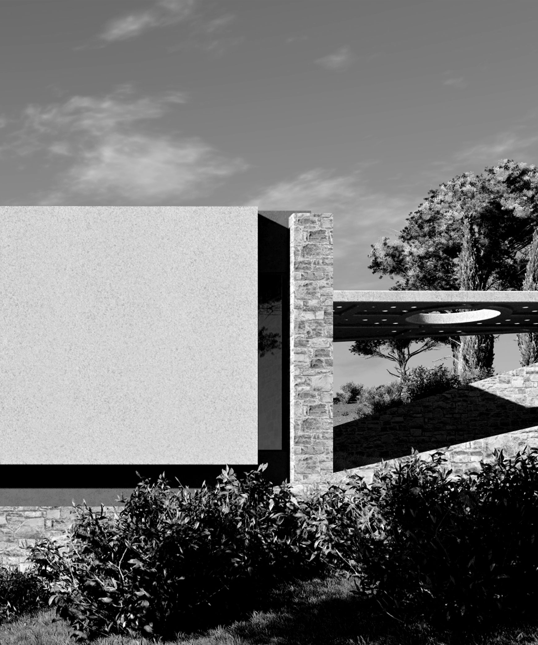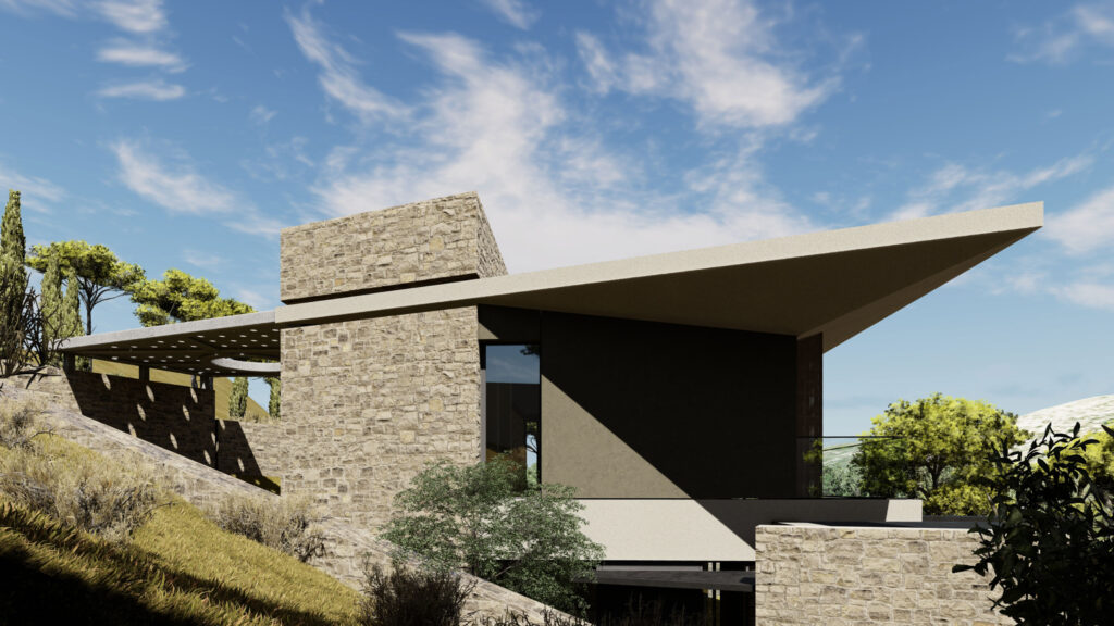 “THE HOUSE” in Penteli is an architectural composition that derives its morphological identity from the geometry of the landscape and the dynamics of the slope of the terrain. The sloping large surfaces that define the building function as an extension of the land, unifying the natural and built environment in a continuous flow. The architecture does not reproduce the typical dwelling but reinterprets it through prismatic volumes that interlock, creating a space that seems to emerge organically from the stony horizon of Penteli.The materiality of the residence is formed by a combination of stone, plaster, concrete and glass, in a dialectical balance between robustness and transparency. The stone, drawn from the land of Penteli itself, lends an earthy feel and integration to the landscape, while the white plaster acts as a neutral surface reflecting the Mediterranean light. The exposed concrete reinforces the tectonic substance of the building, while the glass deconstructs the boundaries, allowing views to permeate the residence and creating a continuous interaction with the natural environment.The sloping surfaces reinforce the sense of movement and flow in the space, both visually and functionally. Inside, light diffuses through strategically placed openings, creating an alternation of light and shadow that changes throughout the day. The result is a dwelling that is not limited to static, but converses with time, landscape and the human experience, making “The House” an architectural statement for contemporary living.