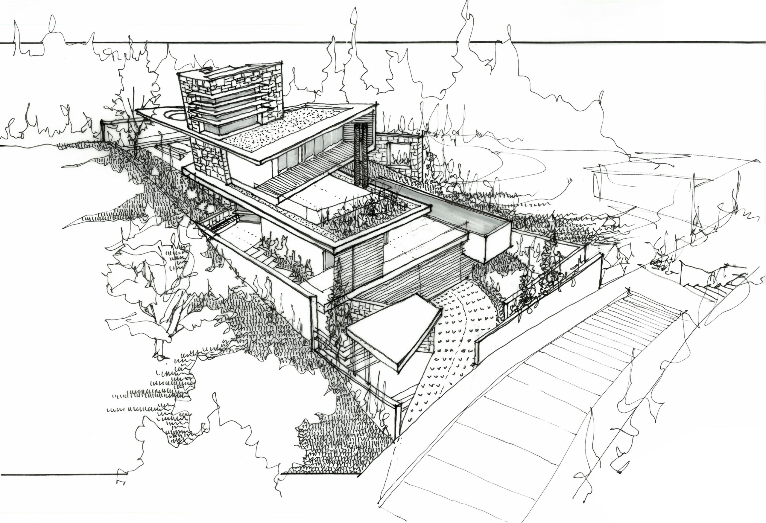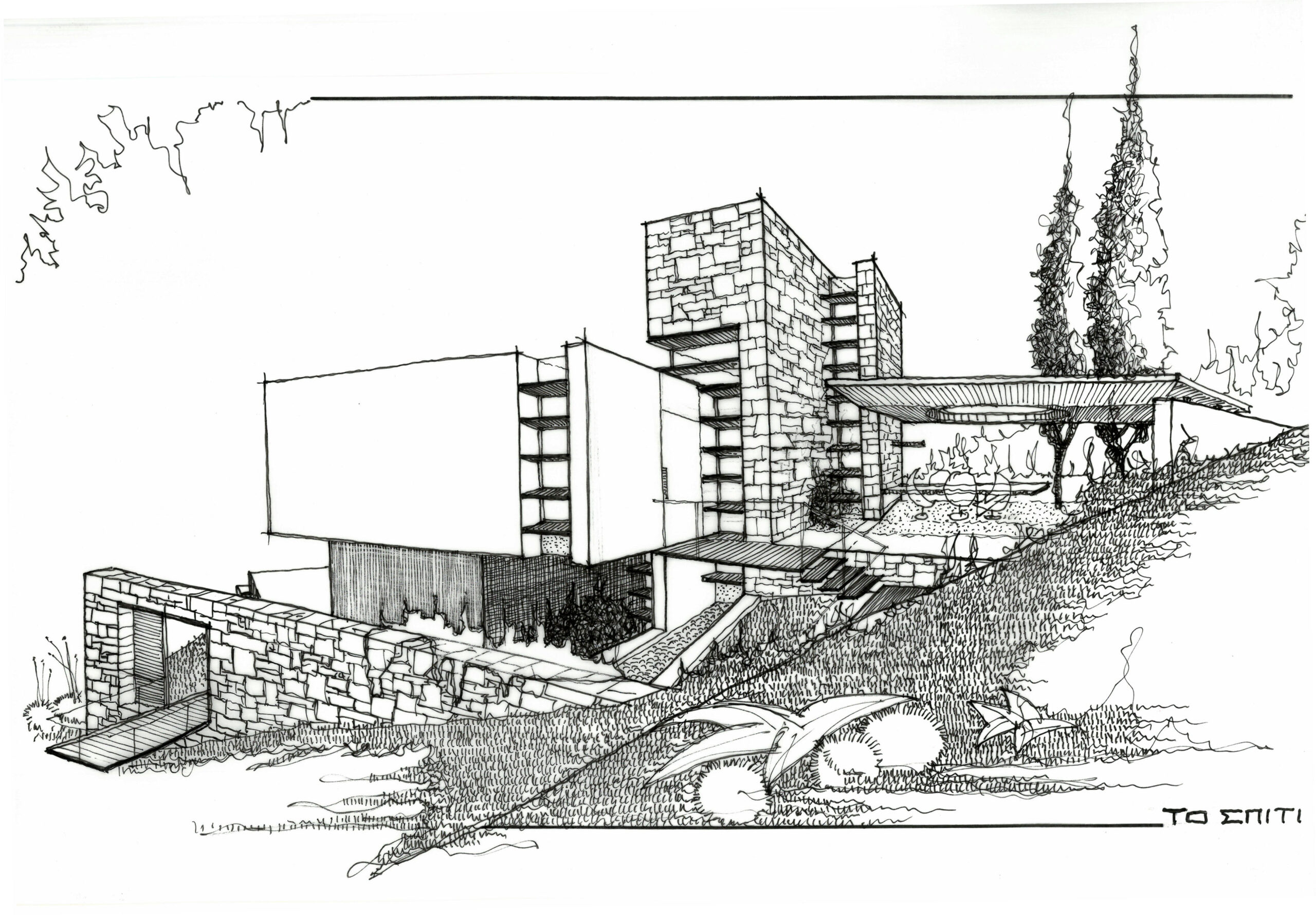 “ΤΟ ΣΠΙΤΙ” στην Πεντέλη είναι μια αρχιτεκτονική σύνθεση που αντλεί τη μορφολογική της ταυτότητα από τη γεωμετρία του τοπίου και τη δυναμική της κλίσης του εδάφους. Οι κεκλιμένες μεγάλες επιφάνειες που ορίζουν το κτίριο λειτουργούν ως μια προέκταση της γης, ενοποιώντας το φυσικό και το δομημένο περιβάλλον σε μια συνεχόμενη ροή. Η αρχιτεκτονική του δεν αναπαράγει την τυπική κατοικία αλλά την αναδιατυπώνει μέσα από πρισματικούς όγκους που αλληλοσυμπλέκονται, δημιουργώντας έναν χώρο που μοιάζει να αναδύεται οργανικά από τον πετρώδη ορίζοντα της Πεντέλης. Η υλικότητα της κατοικίας διαμορφώνεται από έναν συνδυασμό πέτρας, σοβά, σκυροδέματος και γυαλιού, σε μια διαλεκτική ισορροπία μεταξύ στιβαρότητας και διαφάνειας. Η πέτρα, αντλημένη από την ίδια τη γη της Πεντέλης, προσδίδει γήινη αίσθηση και ένταξη στο τοπίο, ενώ ο λευκός σοβάς λειτουργεί ως μια ουδέτερη επιφάνεια που αντανακλά το μεσογειακό φως. Το εμφανές σκυρόδεμα ενισχύει την τεκτονική υπόσταση του κτιρίου, ενώ το γυαλί αποδομεί τα όρια, επιτρέποντας στη θέα να διαπερνά την κατοικία και δημιουργώντας μια συνεχή διάδραση με το φυσικό περιβάλλον. Οι κεκλιμένες επιφάνειες ενισχύουν την έννοια της κίνησης και της ροής στον χώρο, τόσο οπτικά όσο και λειτουργικά. Στο εσωτερικό, το φως διαχέεται μέσα από στρατηγικά τοποθετημένα ανοίγματα, δημιουργώντας μια εναλλαγή φωτός και σκιάς που μεταβάλλεται κατά τη διάρκεια της ημέρας. Το αποτέλεσμα είναι μια κατοικία που δεν περιορίζεται στη στατικότητα, αλλά συνομιλεί με τον χρόνο, το τοπίο και την ανθρώπινη εμπειρία, καθιστώντας το “Το Σπίτι” μια αρχιτεκτονική δήλωση για τη σύγχρονη κατοίκηση.