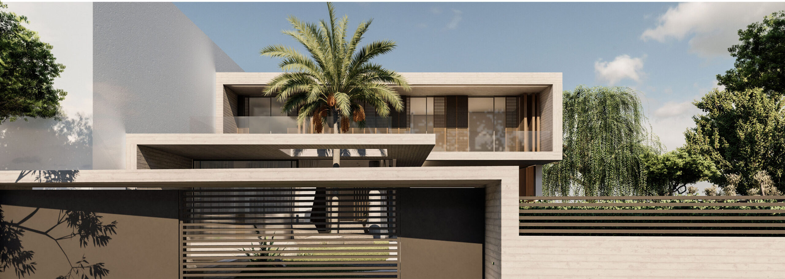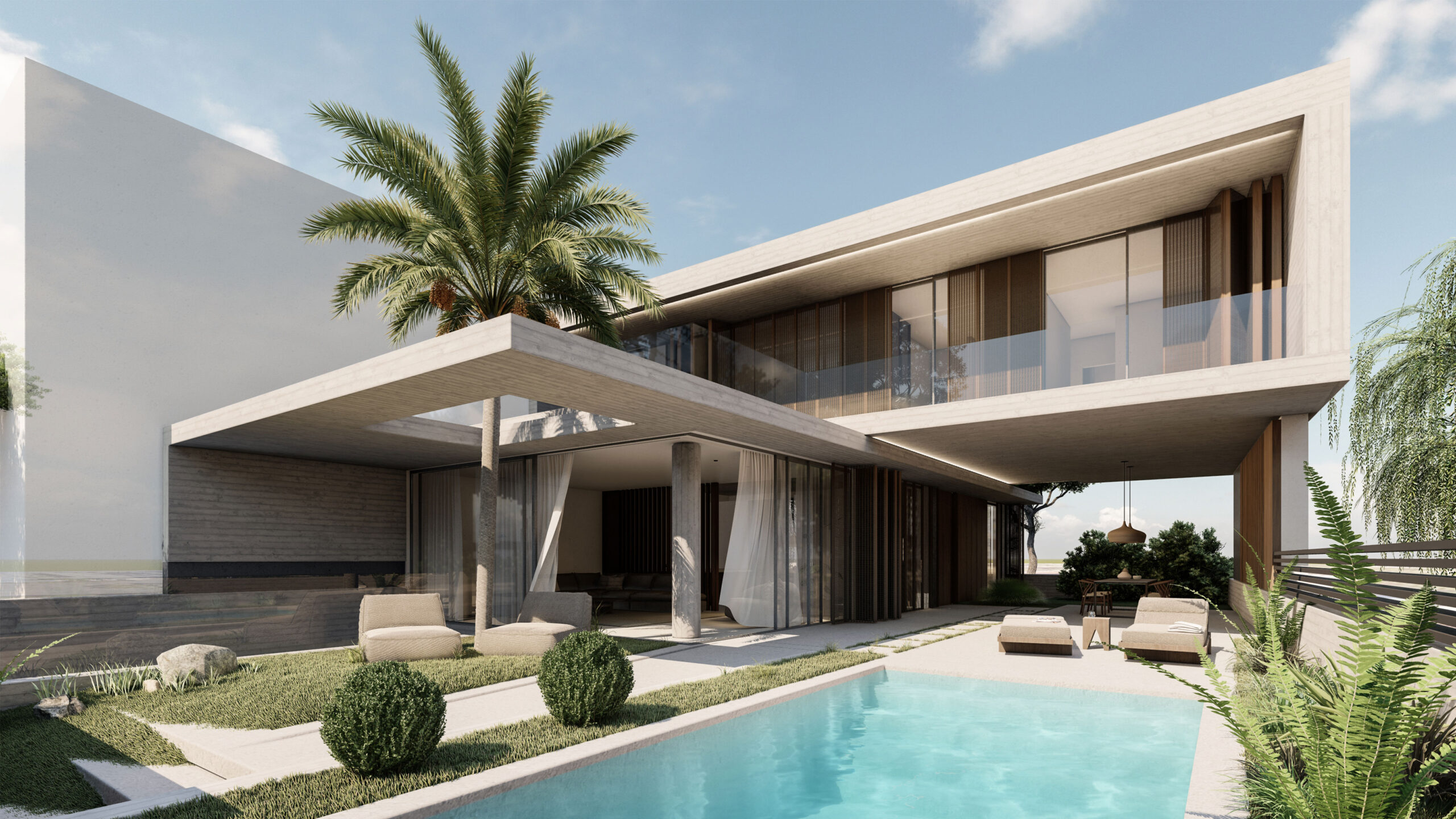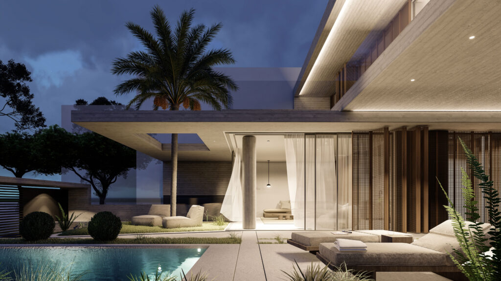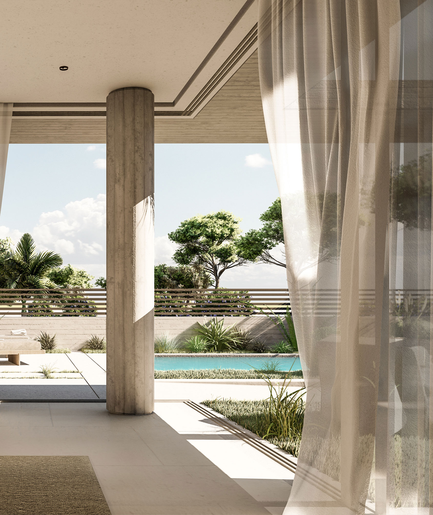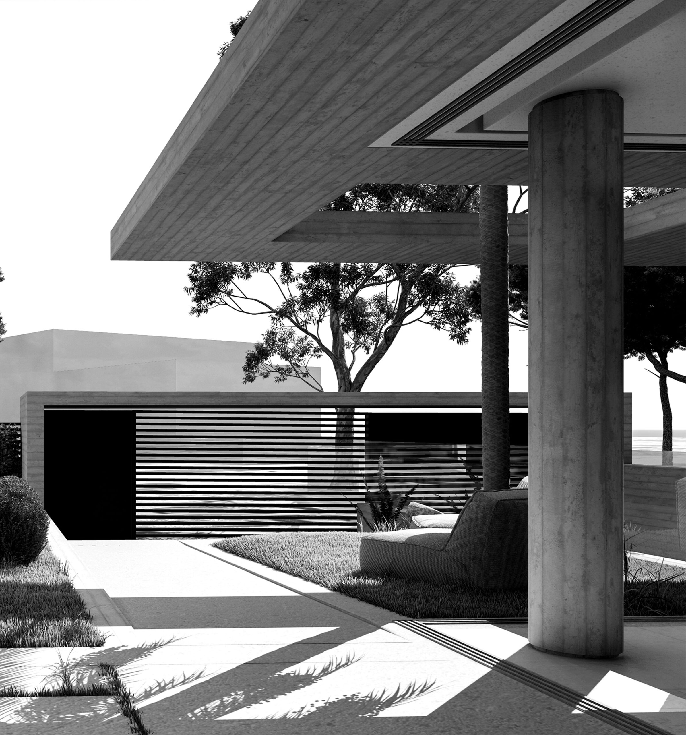 Η μονοκατοικία αυτή ενσωματώνει έναν εξαιρετικά εκλεπτυσμένο σχεδιασμό, όπου τα σύγχρονα υλικά συνδυάζονται με ένα αισθητικό αφαιρετικό μοντέλο που φέρνει σε πλήρη αρμονία τη φυσική και την κατασκευαστική διάσταση του χώρου. Η αρχιτεκτονική της κατασκευής βασίζεται σε μια εξαιρετικά ελαφριά και διακριτική χρήση στοιχείων, με τις εξωτερικές επιφάνειες να αποκαλύπτουν την αυθεντικότητα του σκυροδέματος, το οποίο παραμένει εμφανές και ακατέργαστο, προσδίδοντας έναν βιομηχανικό χαρακτήρα που διατηρεί παράλληλα μια αίσθηση φυσικότητας και ανθεκτικότητας.