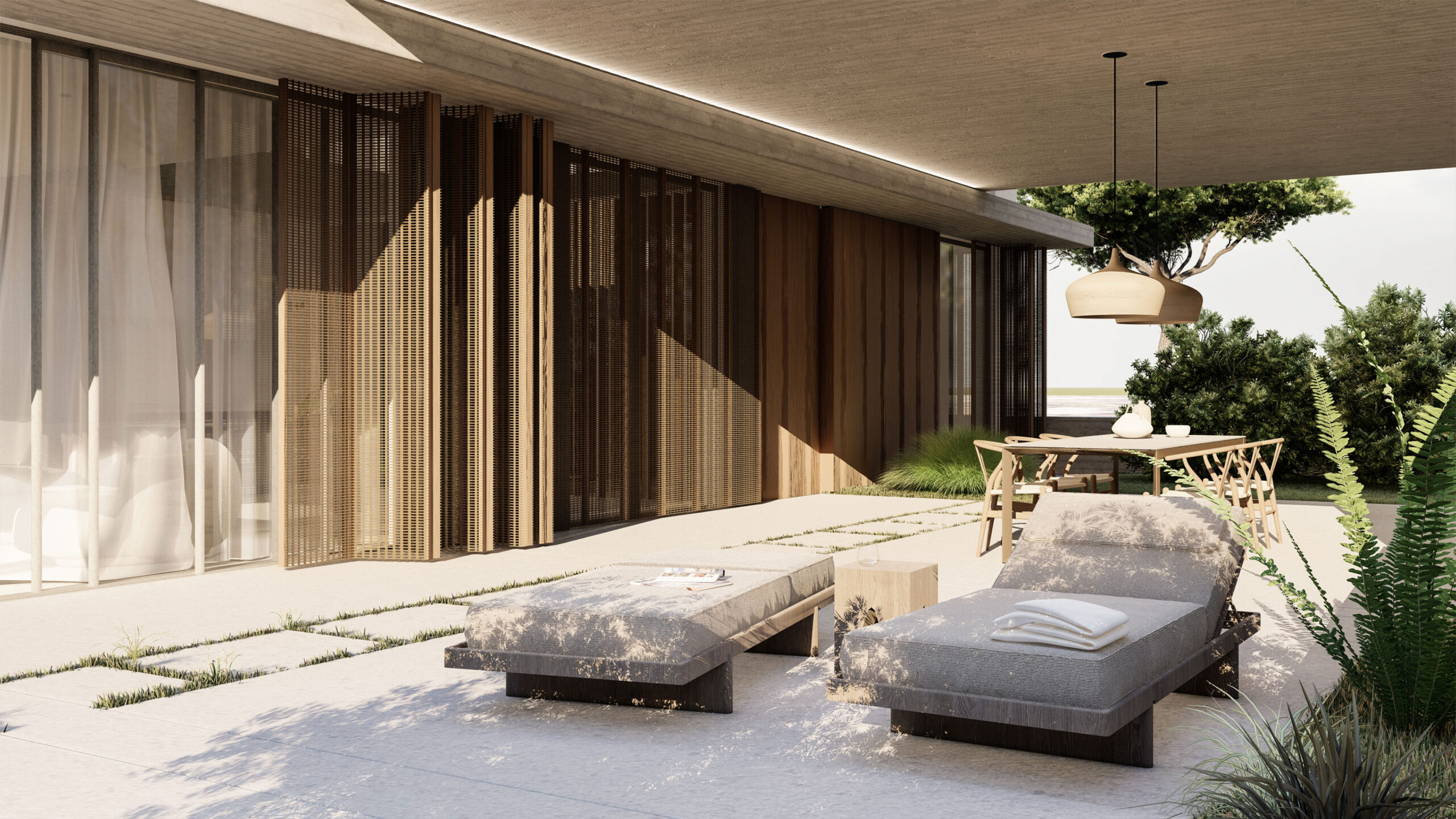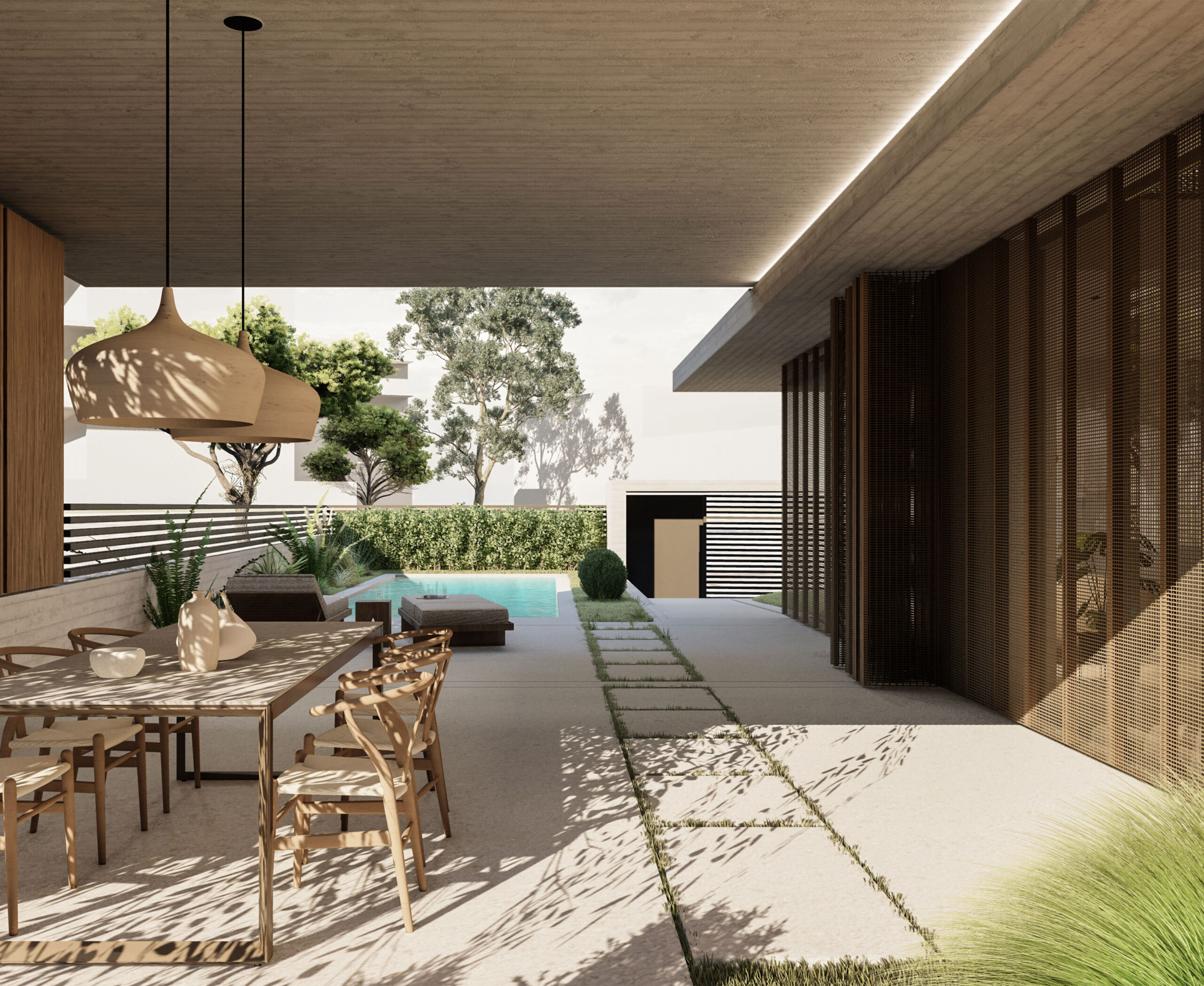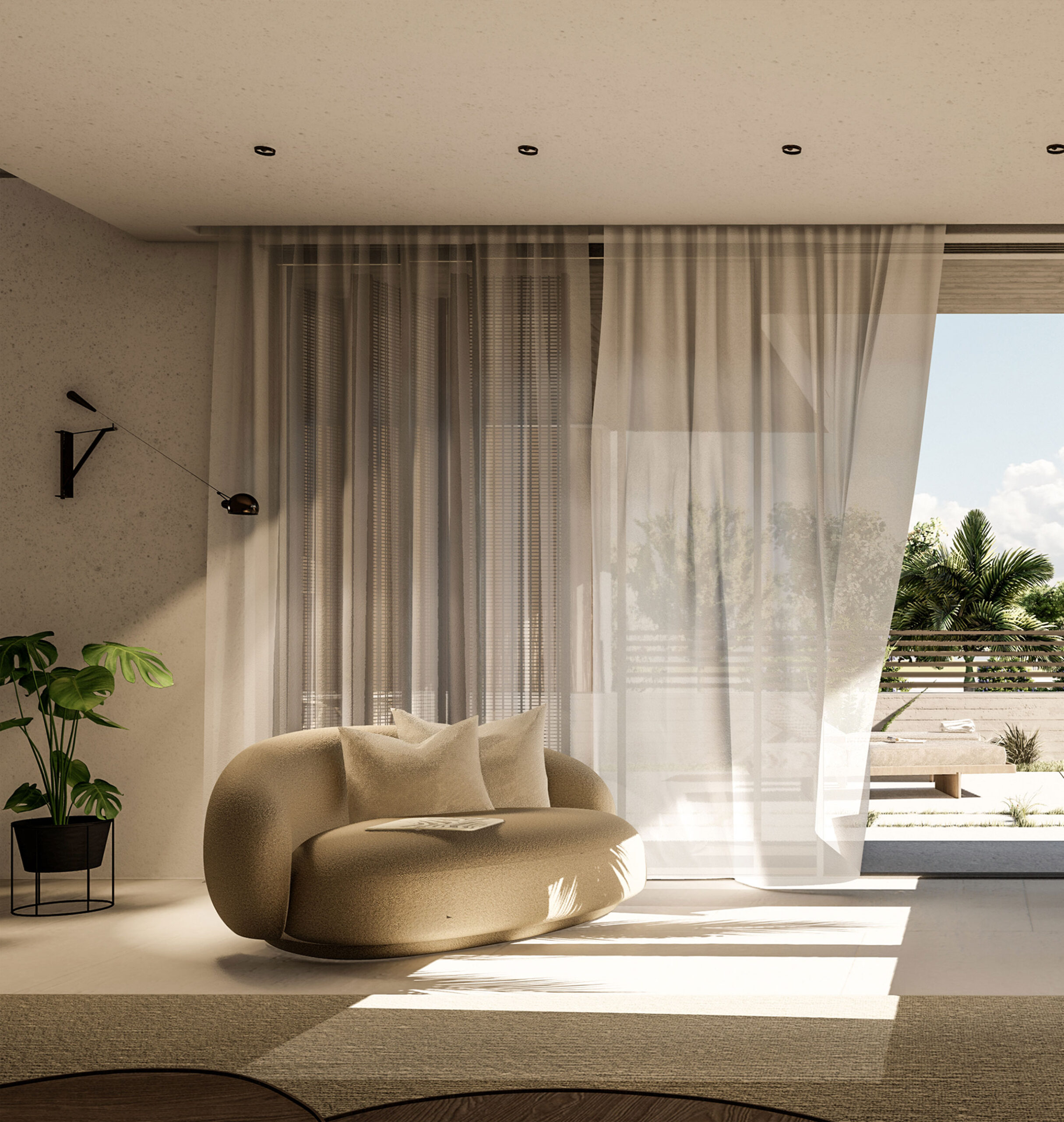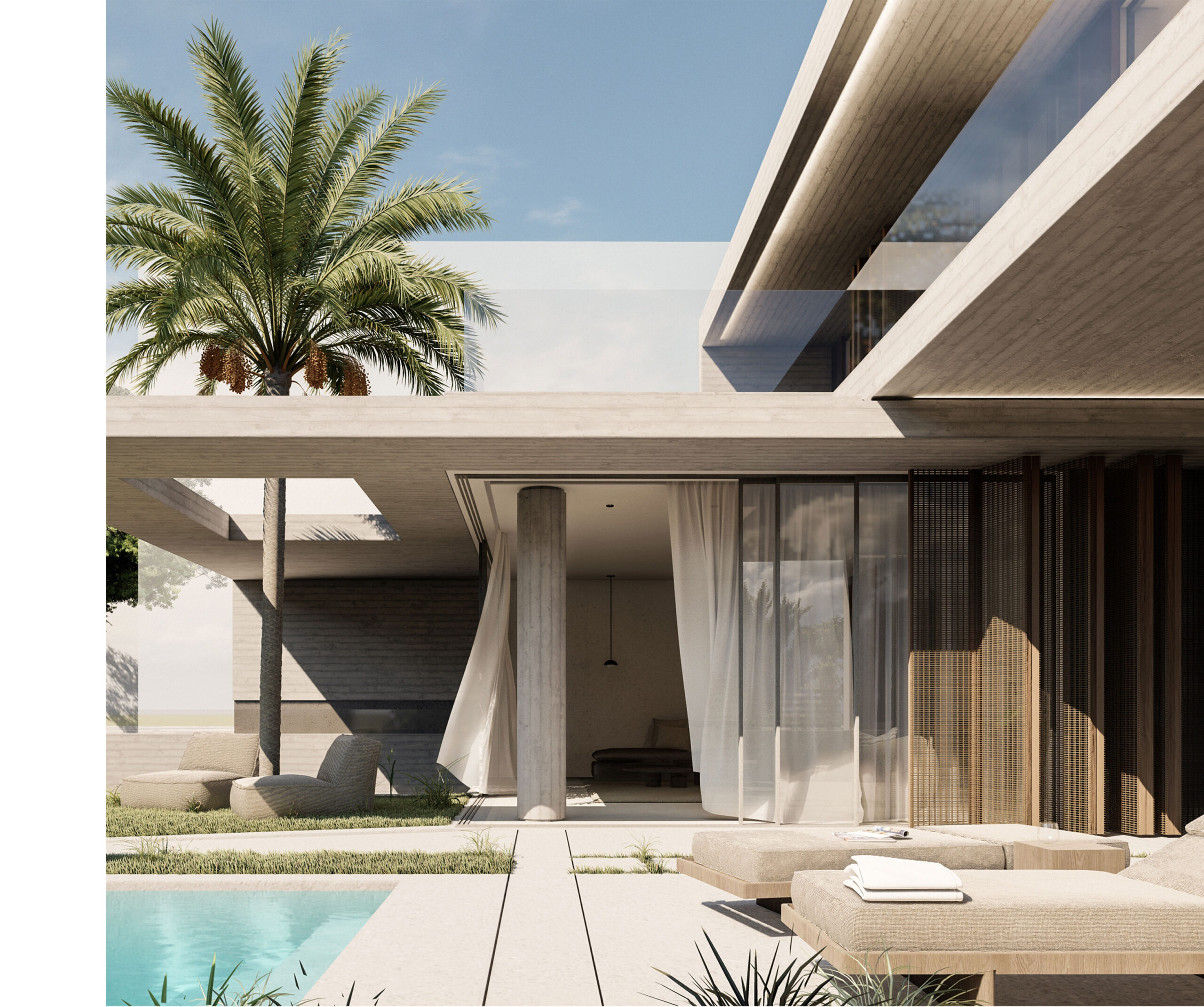 Η μονοκατοικία αυτή ενσωματώνει έναν εξαιρετικά εκλεπτυσμένο σχεδιασμό, όπου τα σύγχρονα υλικά συνδυάζονται με ένα αισθητικό αφαιρετικό μοντέλο που φέρνει σε πλήρη αρμονία τη φυσική και την κατασκευαστική διάσταση του χώρου. Η αρχιτεκτονική της κατασκευής βασίζεται σε μια εξαιρετικά ελαφριά και διακριτική χρήση στοιχείων, με τις εξωτερικές επιφάνειες να αποκαλύπτουν την αυθεντικότητα του σκυροδέματος, το οποίο παραμένει εμφανές και ακατέργαστο, προσδίδοντας έναν βιομηχανικό χαρακτήρα που διατηρεί παράλληλα μια αίσθηση φυσικότητας και ανθεκτικότητας.